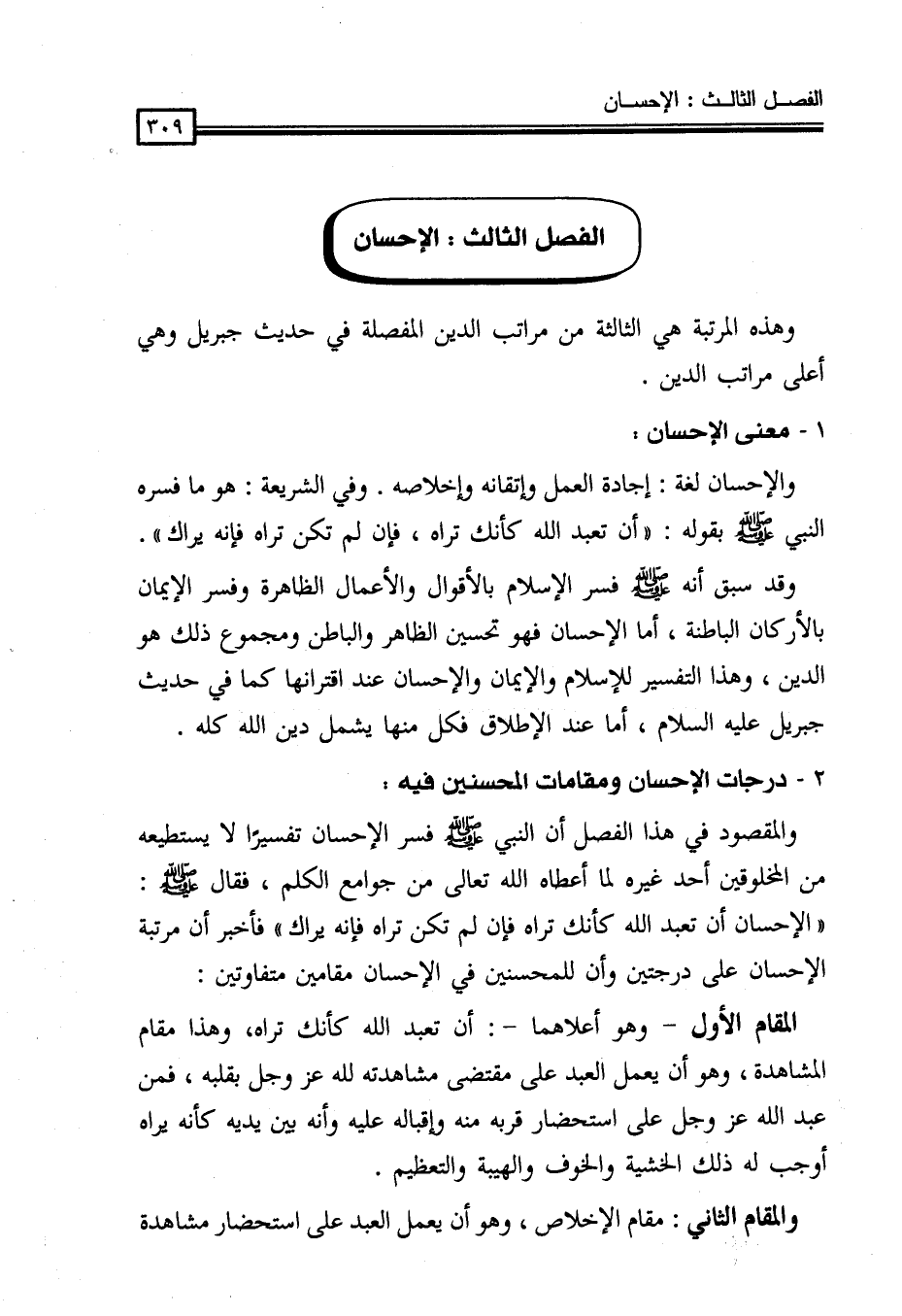 والمقصود في هذا الفصل أن النبي - صلى الله عليه وسلم - فسر الإحسان تَفْسِيرًا لَا يَسْتَطِيعُهُ مِنَ الْمَخْلُوقِينَ أَحَدٌ غَيْرَهُ لِمَا أَعْطَاهُ اللَّهُ تَعَالَى مِنْ جَوَامِعِ الْكَلِمِ، فَقَالَ - صَلَّى اللَّهُ عَلَيْهِ وَسَلَّمَ -: (الْإِحْسَانُ أَنْ تَعْبُدَ اللَّهَ كَأَنَّكَ تَرَاهُ فَإِنْ لَمْ تَكُنْ تراه فإنه يراك) فأخبر أَنَّ مَرْتَبَةَ الْإِحْسَانِ عَلَى دَرَجَتَيْنِ وَأَنَّ لِلْمُحْسِنِينَ فِي الْإِحْسَانِ مَقَامَيْنِ مُتَفَاوِتَيْنِ: