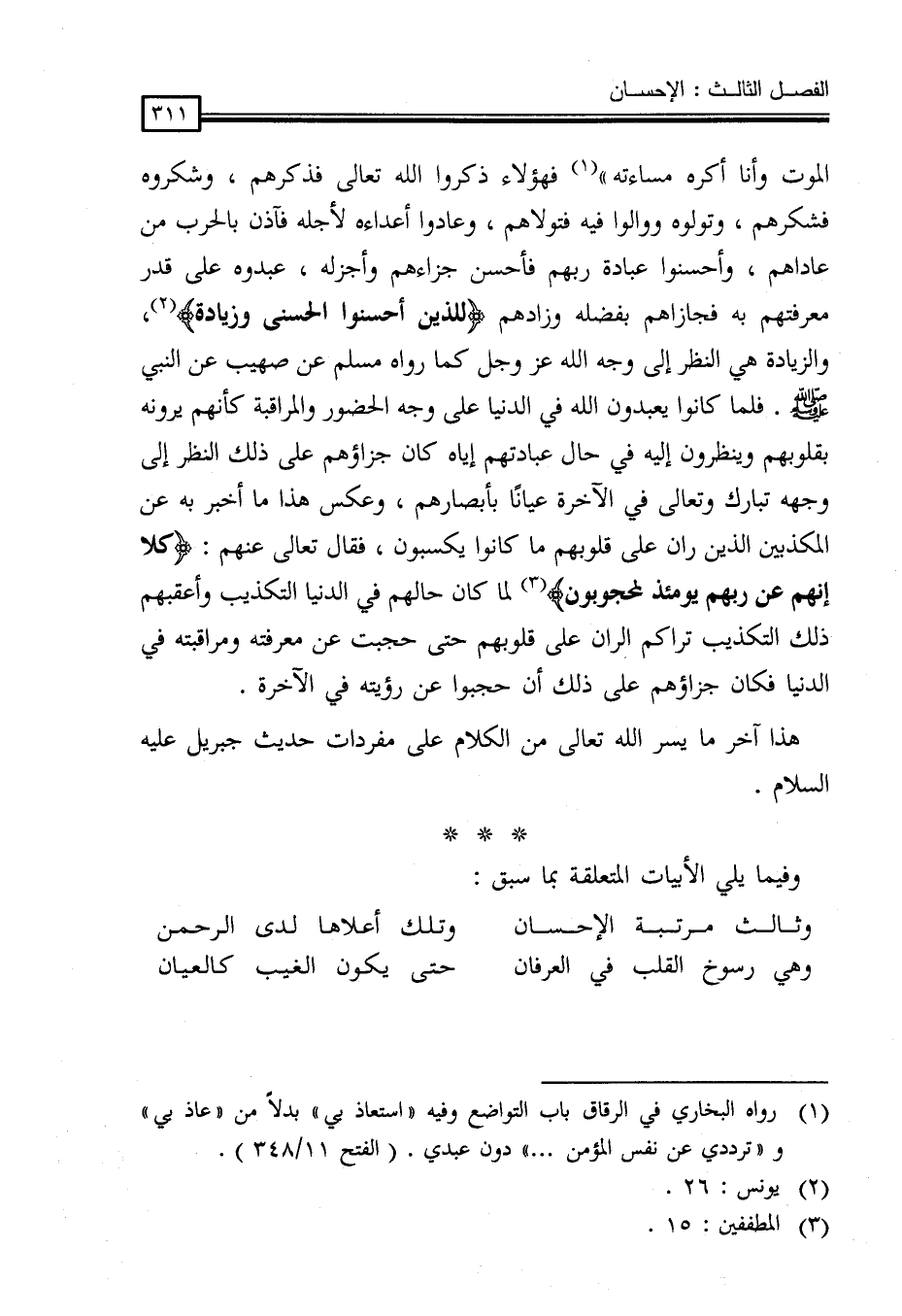 وَثَالِثٌ مَرْتَبَةُ الْإِحْسَانِ ... وَتِلْكَ أَعْلَاهَا لَدَى الرَّحْمَنِ