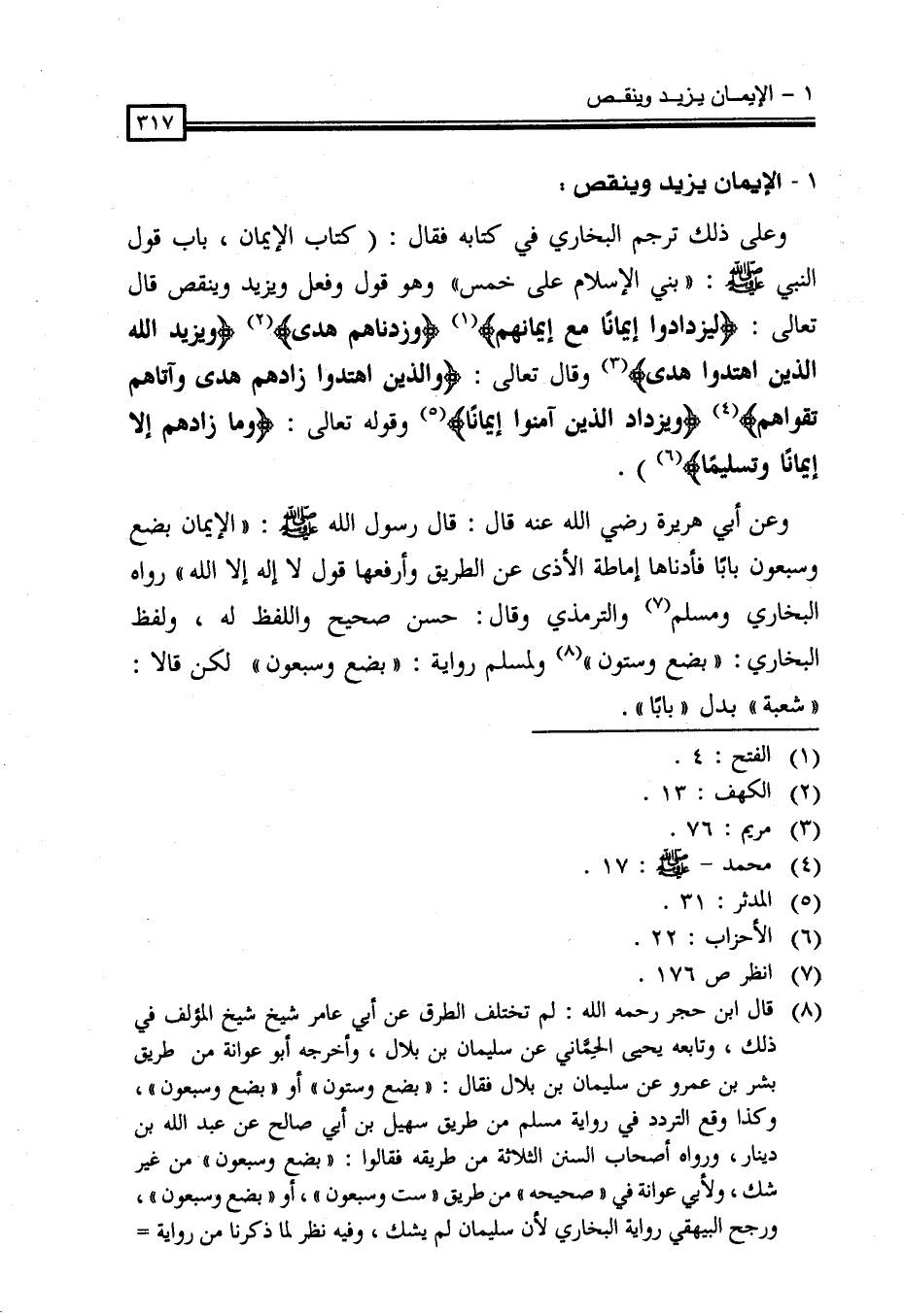 وَعَلَى ذَلِكَ تَرْجَمَ الْبُخَارِيُّ في كتابه فقال: (كِتَابِ الْإِيمَانِ، بَابُ قَوْلِ النَّبِيِّ - صَلَّى اللَّهُ عَلَيْهِ وَسَلَّمَ -: (بُنِيَ الْإِسْلَامُ عَلَى خَمْسٍ) وَهُوَ قول وفعل يزيد وينقص قال تعالى: {ليزدادوا إيماناً مع إيمانهم} (¬1) {وزدناهم هدى} (¬2) {ويزيد الله الذين اهتدوا هدى} (¬3) وَقَالَ تَعَالَى: {وَالَّذِينَ اهْتَدَوْا زَادَهُمْ هُدًى وَآتَاهُمْ تقواهم} (¬4) {ويزيد الذين آمنوا إيماناً} (¬5) وَقَوْلُهُ تَعَالَى: {وَمَا زَادَهُمْ إِلَّا إِيمَانًا وَتَسْلِيمًا} (¬6)) .