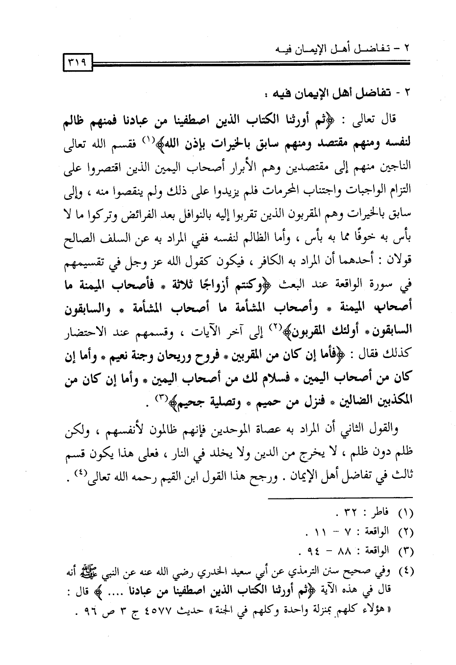 (¬4) وفي صحيح سنن الترمذي عَنْ أَبِي سَعِيدٍ الْخُدْرِيِّ رَضِيَ اللَّهُ عَنْهُ عَنِ النَّبِيِّ - صَلَّى اللَّهُ عَلَيْهِ وَسَلَّمَ - أَنَّهُ قال في هذه الآية {ثم أورثنا الكتاب الذين اصطفيناه من عبادنا ... } قال: (هؤلاء كلهم بمنزلة واحدة وكلهم في الجنة) حديث 4577ج3ص96.