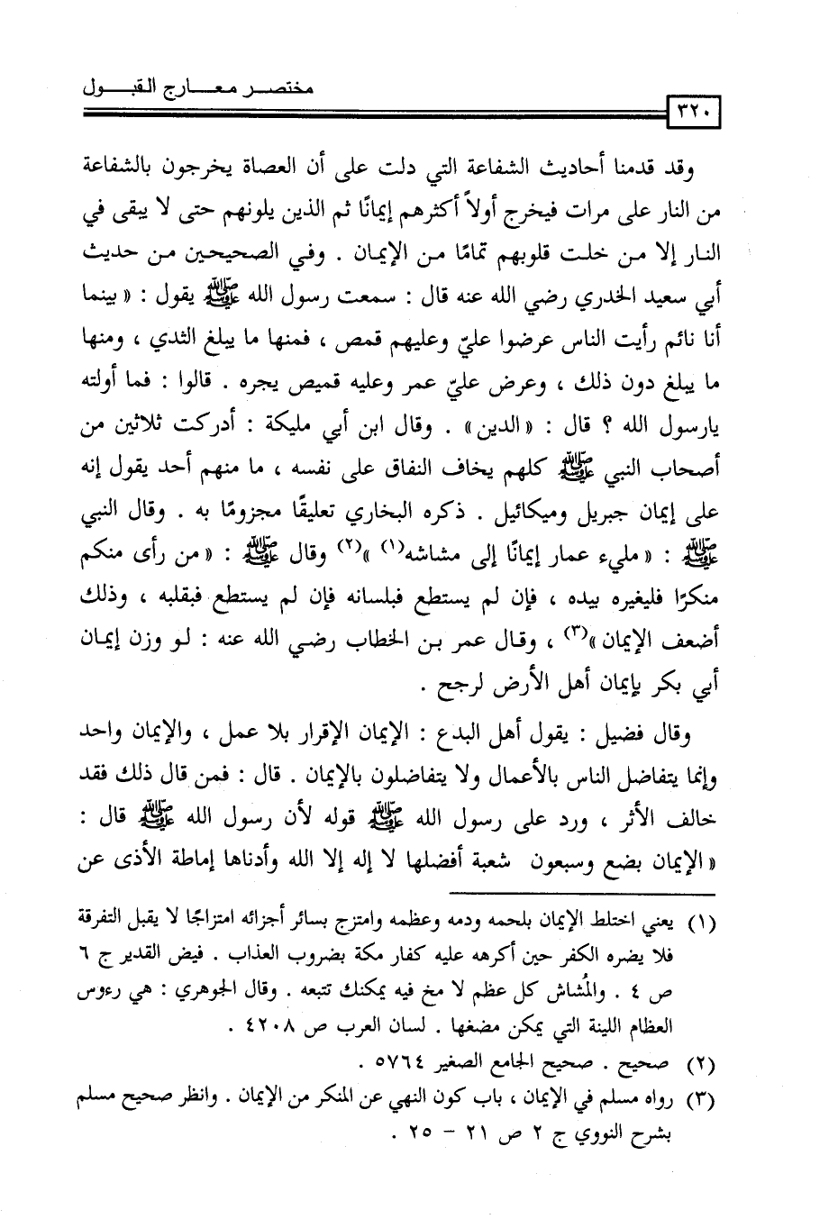 وقد قمنا أحاديث الشفاعة التي دلت على أن العصاة يخرجون بالشفاعة من النار على مرات فيخرج أولاً أكثرهم إيماناً ثم الذين يلونهم حتى لا يبقى في النار إلا من خلت قلوبهم من الإيمان. وَفِي الصَّحِيحَيْنِ مِنْ حَدِيثِ أَبِي سَعِيدٍ الْخُدْرِيِّ رَضِيَ اللَّهُ عَنْهُ قَالَ: سَمِعْتُ رَسُولَ اللَّهِ - صَلَّى اللَّهُ عَلَيْهِ وَسَلَّمَ - يَقُولُ: (بَيْنَمَا أَنَا نَائِمٌ رَأَيْتُ النَّاسَ عُرِضُوا عَلَيَّ وَعَلَيْهِمْ قُمُصٌ، فمنها ما يبغ الثدي، ومنها ما يبغ دُونَ ذَلِكَ، وَعُرِضَ عَلَيَّ عُمَرُ وَعَلَيْهِ قَمِيصٌ يَجُرُّهُ. قَالُوا: فَمَا أَوَّلْتَهُ يَا رَسُولَ اللَّهِ؟ قَالَ: (الدِّينَ) . وَقَالَ ابْنُ أَبِي مُلَيْكَةَ: أَدْرَكْتُ ثَلَاثِينَ مِنْ أَصْحَابِ النَّبِيِّ - صَلَّى اللَّهُ عَلَيْهِ وَسَلَّمَ - كُلُّهُمْ يَخَافُ النِّفَاقَ عَلَى نَفْسِهِ، مَا مِنْهُمْ أَحَدٌ يَقُولُ إِنَّهُ عَلَى إِيمَانِ جِبْرِيلَ وَمِيكَائِيلَ. ذَكَرَهُ الْبُخَارِيُّ تَعْلِيقًا مَجْزُومًا بِهِ. وَقَالَ النبي - صلى الله عليه وسلم -: (مليء عَمَّارٌ إِيمَانًا إِلَى مُشَاشِهِ (¬1)) (¬2) وَقَالَ - صَلَّى اللَّهُ عَلَيْهِ وَسَلَّمَ -: (مَنْ رَأَى مِنْكُمْ مُنْكَرًا فَلْيُغَيِّرْهُ بِيَدِهِ، فَإِنْ لَمْ يَسْتَطِعْ فَبِلِسَانِهِ فَإِنْ لَمْ يَسْتَطِعْ فَبِقَلْبِهِ، وَذَلِكَ أَضْعَفُ الْإِيمَانِ) (¬3) ، وَقَالَ عُمَرُ بْنُ الْخَطَّابِ رَضِيَ اللَّهُ عَنْهُ: لَوْ وُزِنَ إِيمَانُ أَبِي بَكْرٍ بِإِيمَانِ أَهْلِ الْأَرْضِ لَرَجَحَ.