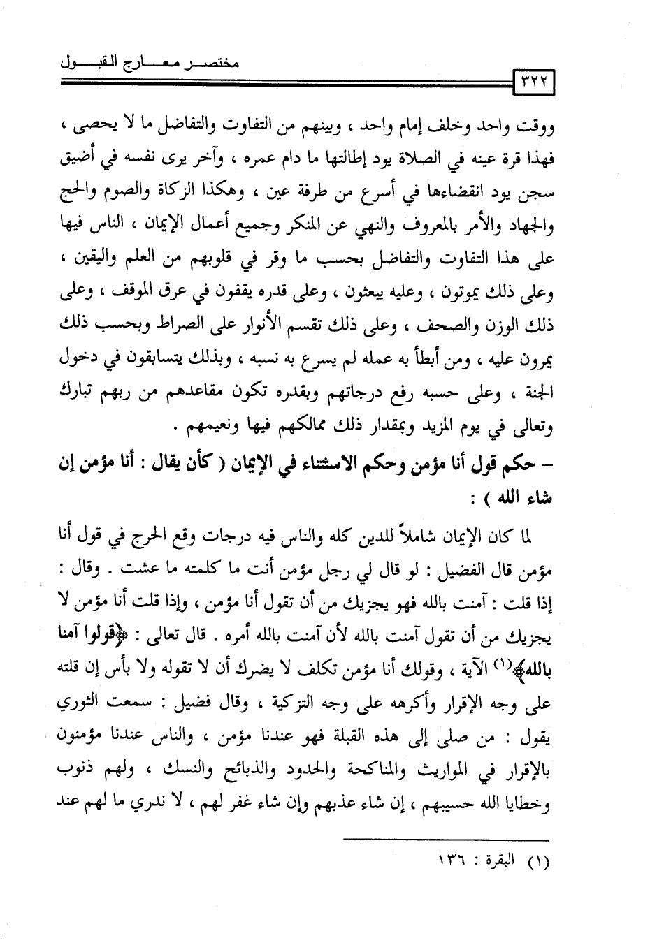 لما كان الإيمان شاملاً للدين كله والناس فيه درجات وقع الحرج في قول أنا مؤمن قال الفضيل: لو قال رَجُلٌ مُؤْمِنٌ أَنْتَ مَا كَلَّمْتُهُ مَا عِشْتَ. وَقَالَ: إِذَا قُلْتَ: آمَنْتُ بِاللَّهِ فَهُوَ يَجْزِيكَ مِنْ أَنْ تَقُولَ أَنَا مُؤْمِنٌ، وَإِذَا قُلْتَ أَنَا مُؤْمِنٌ لَا يَجْزِيكَ مِنْ أَنْ تَقُولَ آمنت بالله لأن آمنت بالله أمره. قال تعالى: {قولوا آمنا بالله} (¬1) الْآيَةَ وَقَوْلُكَ أَنَا مُؤْمِنٌ تَكَلُّفٌ لَا يَضُرُّكَ أَنْ لَا تَقَوُّلَهُ وَلَا بَأْسَ إِنْ قُلْتَهُ عَلَى وَجْهِ الْإِقْرَارِ وَأَكْرَهُهُ عَلَى وَجْهِ التَّزْكِيَةِ، وَقَالَ فُضَيْلٌ: سَمِعْتُ الثَّوْرِيَّ يَقُولُ: مَنْ صَلَّى إِلَى هَذِهِ الْقِبْلَةِ فَهُوَ عِنْدَنَا مُؤْمِنٌ، وَالنَّاسُ عِنْدَنَا مُؤْمِنُونَ بِالْإِقْرَارِ فِي الْمَوَارِيثِ وَالْمُنَاكَحَةِ وَالْحُدُودِ والذبائح والنسك، ولهم ذنوب وخطايا الله حسيبهم، إن شاء عذبهم وإنشاء غَفَرَ لَهُمْ، لَا نَدْرِي مَا لَهُمْ عِنْدَ