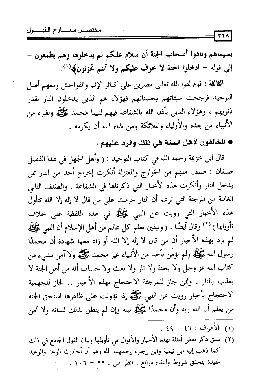(¬2) سبق ذكر بعض أمثلة لهذه الأخبار والأقوال في تأويلها وبيان القول الجامع في ذلك كما ذهب إليه ابن تيمية وابن رجب رحمهما الله وهو أن أحاديث الوعد والوعيد مقيدة بتحقيق شروط وانتفاء موانع. انظر ص: 99-106.