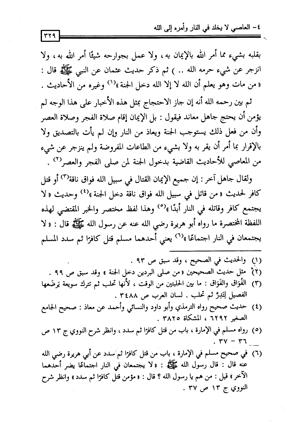 (¬6) في صحيح مسلم في الإمارة، باب من قتل كافراً ثم سدد عَنْ أَبِي هُرَيْرَةَ رَضِيَ اللَّهُ عَنْهُ قَالَ: قَالَ رَسُولُ اللَّهِ - صَلَّى اللَّهُ عَلَيْهِ وَسَلَّمَ -: (لا يجتمعان في النار اجتماعاً يضر أحدهما الآخر) قيل: من هم يا رسول الله؟ قال: (مؤمن قتل كافراً سم سدد) وانظر شرح النووي ج 13 ص 37.