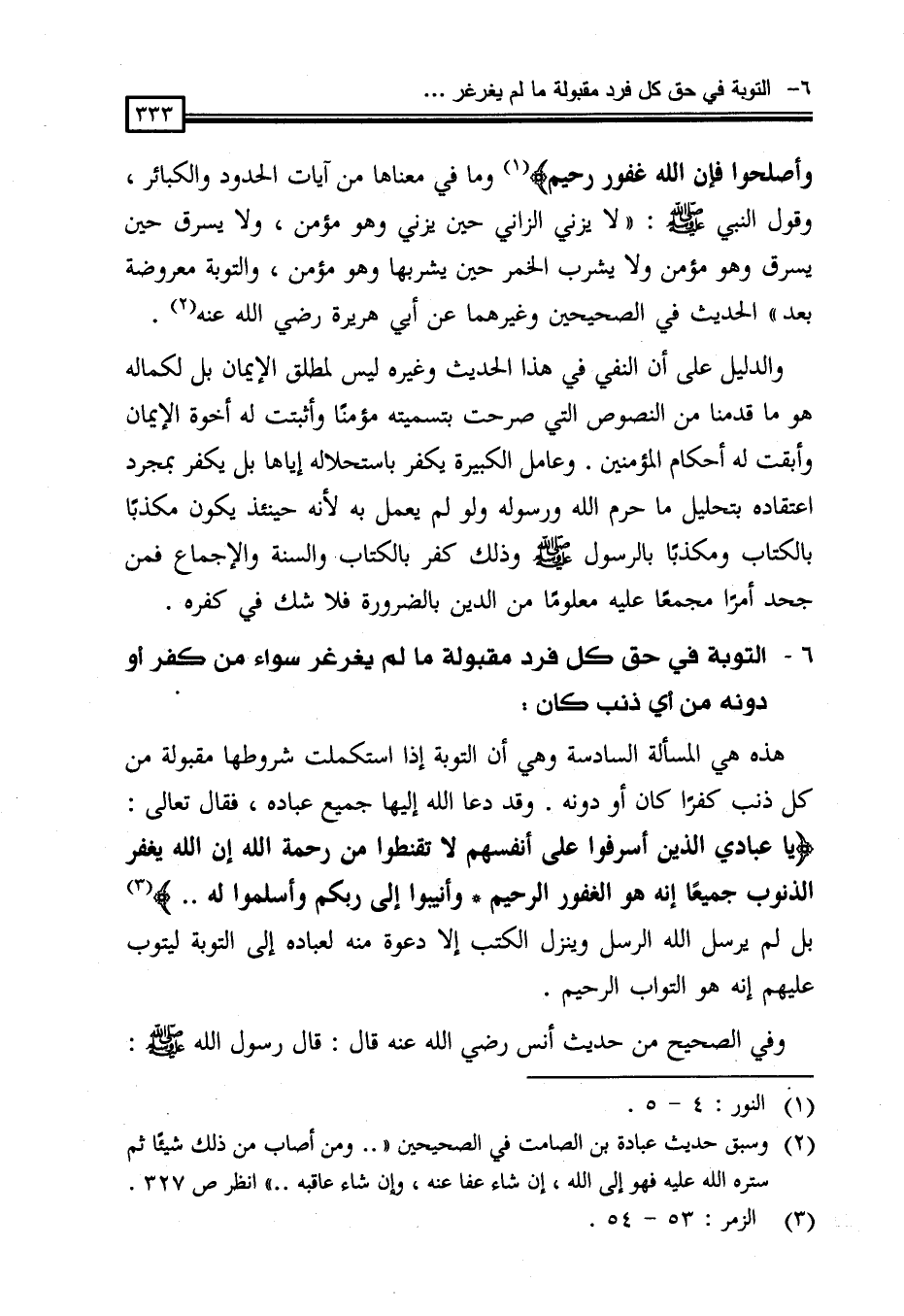 وأصلحوا فإن الله غفور رحيم} (¬1) وَمَا فِي مَعْنَاهَا مِنْ آيَاتِ الْحُدُودِ وَالْكَبَائِرِ، وقو النَّبِيِّ - صَلَّى اللَّهُ عَلَيْهِ وَسَلَّمَ -: (لَا يَزْنِي الزاني حين يزني وهو مؤمن، ويسرق حين يسرق وهو مؤمن ولا يشرب الخمر حين يشربها وَهُوَ مُؤْمِنٌ، وَالتَّوْبَةُ مَعْرُوضَةٌ بَعْدُ) الْحَدِيثُ فِي الصَّحِيحَيْنِ وَغَيْرِهِمَا عَنْ أَبِي هُرَيْرَةَ - رَضِيَ اللَّهُ عَنْهُ - (¬2) .