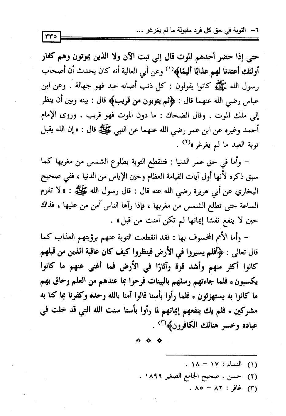 -وأما في حق عمر الدنيا: فتنقطع التوبة بعد طلوع الشمس من مغربها كما سبق ذكره لِأَنَّهَا أَوَّلُ آيَاتِ الْقِيَامَةِ الْعِظَامِ وَحِينَ الْإِيَاسِ من الدنيا، ففي صَحِيحِ الْبُخَارِيِّ عَنْ أَبِي هُرَيْرَةَ - رَضِيَ اللَّهُ عَنْهُ - قَالَ: قَالَ رَسُولُ اللَّهِ - صَلَّى اللَّهُ عَلَيْهِ وَسَلَّمَ -: (لَا تَقُومُ السَّاعَةُ حَتَّى تَطْلُعَ الشَّمْسُ مِنْ مَغْرِبِهَا، فَإِذَا رَآهَا النَّاسُ آمَنَ مَنْ عَلَيْهَا، فَذَاكَ حِينَ لَا يَنْفَعُ نَفْسَا إيمانها لم تكن آمنت من قبل) .