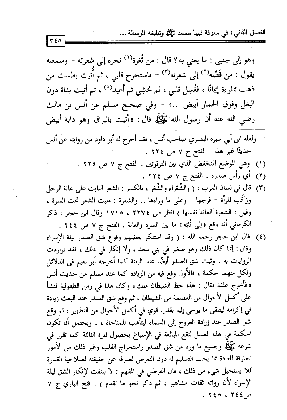 (¬4) قال ابن حجر رحمه الله: (وقد استنكر بعضهم وقوع شق الصدر ليلة الإسراء وقال: إنما كان ذلك وهو صغير في بني سعد، ولا إنكار في ذلك، فقد تواردت الروايات به. وثبت شق الصدر أيضاً عند البعثة كما أخرجه أبو نعيم في الدلائل ولكل منهما حكمة، فالأول وقع فيه من الزيادة كما عند مسلم من حديث أنس (فأخرج علقة فقال: هذا حظ الشيطان منك) وكان هذا في زمن الطفولية فنشأ على أكمل الأحوال من العصمة من الشيطان، ثم وقع شق الصدر عند البعث زيادة في إكرامه ليتلقى ما يوحى إليه بقلب قوي في أكمل الأحوال من التطهير، ثم وقع شق الصدر عند إرادة العروج إلى السماء ليتأهب للمناجاة، ويحتمل أن تكون الحكمة في هذا الغسل لتقع المبالغة في الإسباغ بحصول المرأة الثالثة كما تقرر في شرعه - صلى الله عليه وسلم - وجميع ما ورد من شق الصدر واستخراج القلب وغير ذلك من الأمور الخارقة للعادة مما يجب التسليم له دون التعرض لصرفه عن حقيقته لصلاحية القدرة فلا يستحيل شيء من ذلك، قال القرطبي في المفهم: لا يلتفت لإنكار الشق ليلة الإسراء لأن رواته ثقات مشاهير، ثم ذكر نحو ما تقدم) . فتح الباري ج7 ص244، 245.