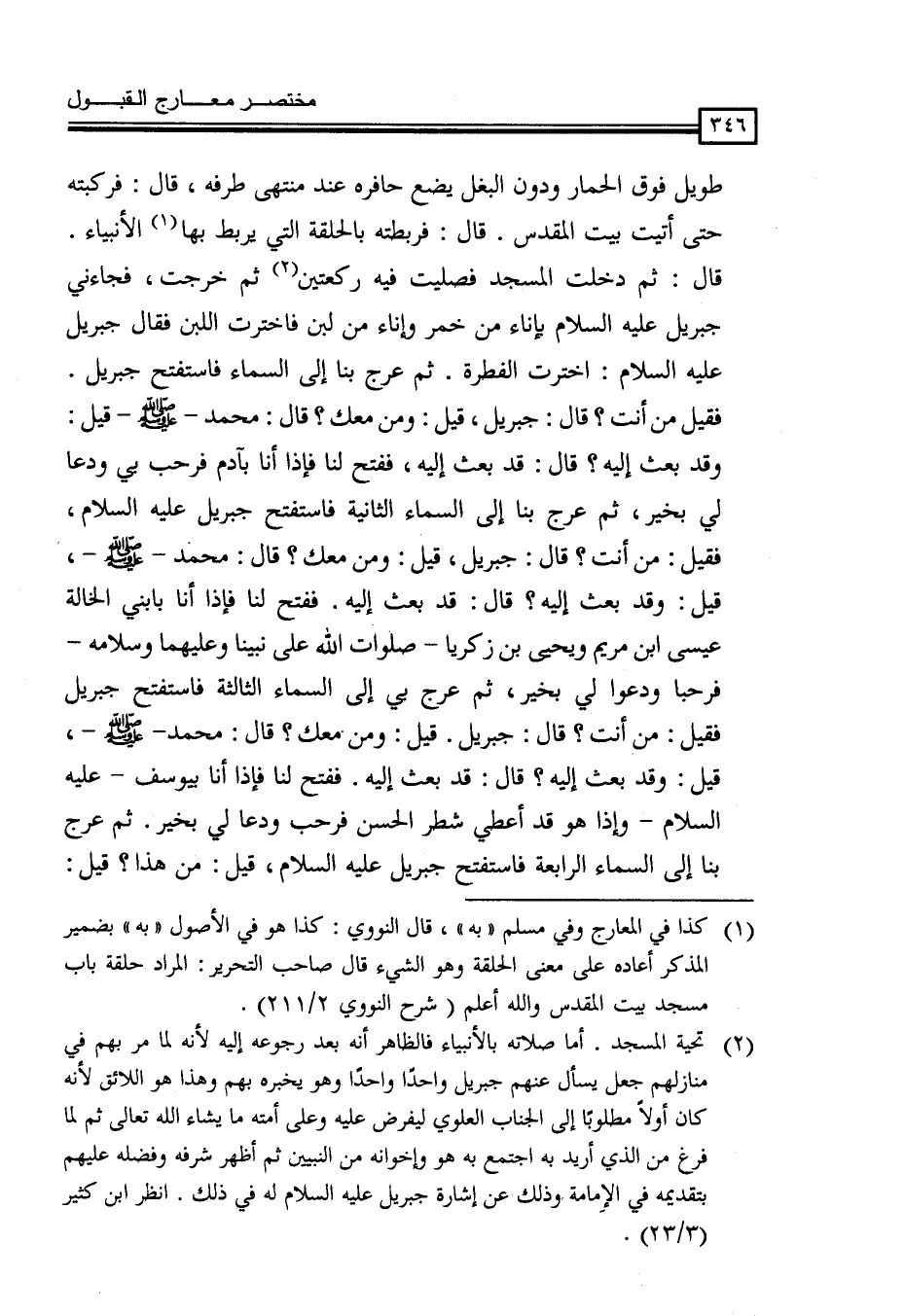 (¬1) كذا في المعارج وفي مسلم (به) ، قال النووي: كذا هو في الأصول (به) بضمير المذكر أعاده على معنى الحلقة وهو الشيء قال صاحب التحرير: المراد حلقة باب مسجد بيت المقدس والله أعلم (شرح النووي 2/211) .