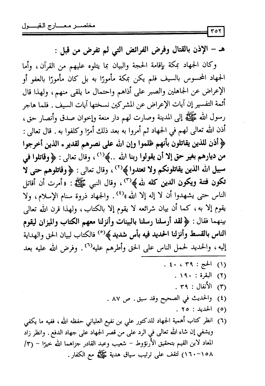 (¬6) انظر كتاب أهمية الجهاد للدكتور علي بن نفيع العلياني حفظه الله، ففيه ما يكفي ويشفي إن شاء الله تعالى في الرد على من قصر الجهاد على جهاد الدفع. وانظر زاد المعاد لابن القيم بتحقيق الأرنؤوط - شعيب وعبد القادر جزاهما الله خيراً - (3/158-160) لتقف على ترتيب هديه - صلى الله عليه وسلم - مع الكفار.