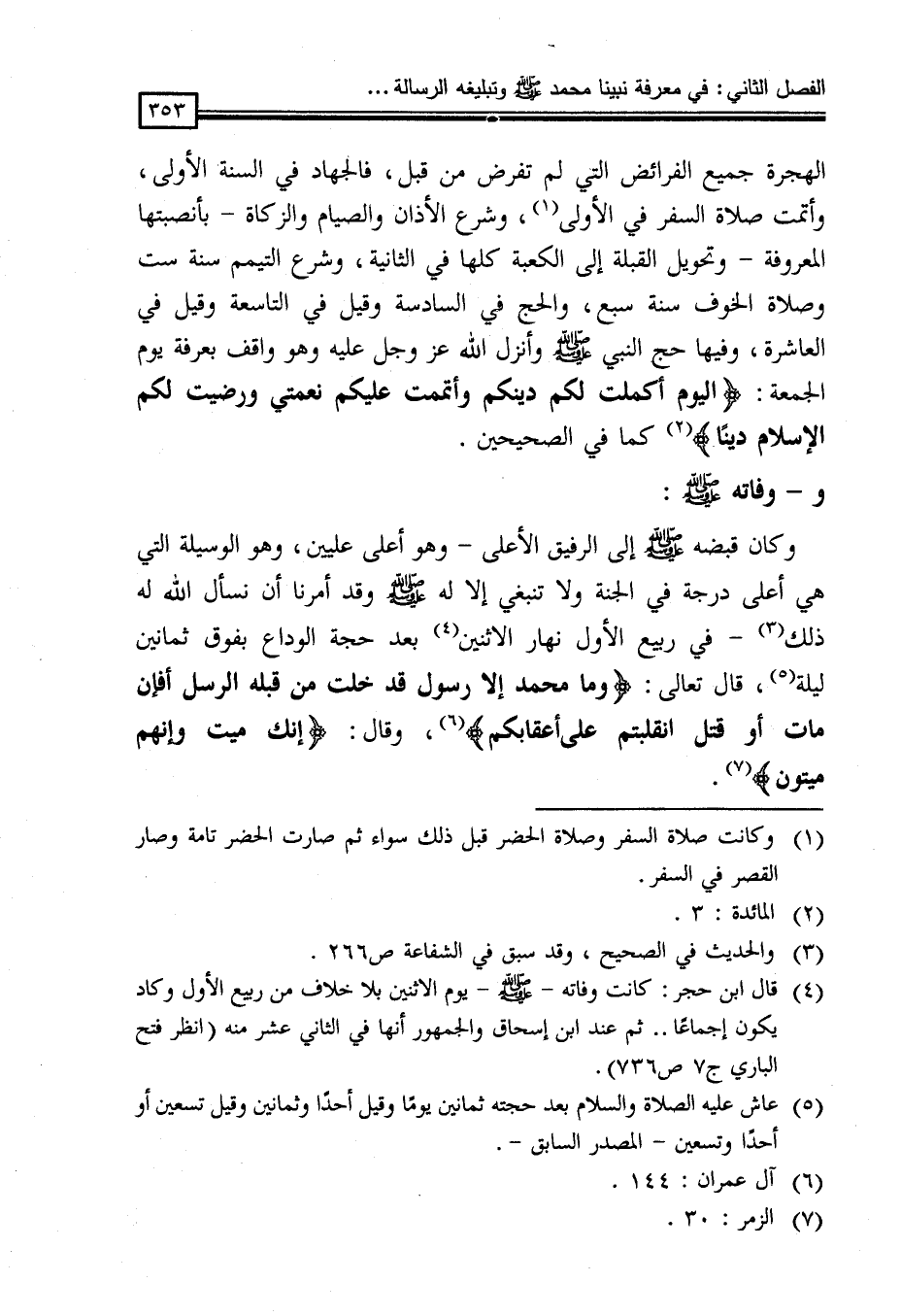 وكان قبضه - صلى الله عليه وسلم - إلى الرفيق الأعلى - وهو أعلى عليين، وهو الْوَسِيلَةُ الَّتِي هِيَ أَعْلَى دَرَجَةً فِي الْجَنَّةِ وَلَا تَنْبَغِي إِلَّا لَهُ - صَلَّى اللَّهُ عَلَيْهِ وَسَلَّمَ - وَقَدْ أَمَرَنَا أَنْ نَسْأَلَ اللَّهَ لَهُ ذلك (¬3) - فِي رَبِيعٍ الْأَوَّلِ نَهَارَ الِاثْنَيْنِ (¬4) بَعْدَ حَجَّةِ الوداع بفوق ثمانين ليلة (¬5) ، قال تَعَالَى: {وَمَا مُحَمَّدٌ إِلَّا رَسُولٌ قَدْ خَلَتْ مِنْ قَبْلِهِ الرُّسُلُ أَفَإِنْ مَاتَ أَوْ قُتِلَ انقلبتم على أعقابكم} (¬6) ، وقال: {إنك ميت وإنهم ميتون} (¬7) .