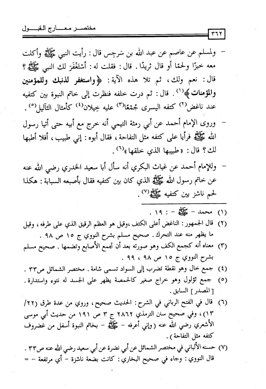 (¬7) حسنه الألباني في مختصر الشمائل عَنْ أَبِي نَضْرَةَ عَنْ أَبِي سَعِيدٍ رَضِيَ الله عنه ص33. قال النووي: وجاء في صحيح اليخاري: كانت بضعة ناشزة - أي مرتفعة - على جسده. وقال أيضاً: قال القاضي: وهذه الروايات متقاربة متفقة على أنها شاخص في حسده قدر بيضة الحمامة وهو نحو بيضة الحجلة وأما رواية جمع الكف وناشز فظاهرها المخالفة فتؤول على وفق الروايات الكثيرة ويكون معناه على هيئة جمع الكف لكنه أصغر منه قدر البيضة الحمامة. صحيح مسلم بشرح النووي ج15 ص98، 99 وكذا يمكن أن يقال مثل ذلك في الرواية التي فيها (مثل التفاحة) والله أعلم.