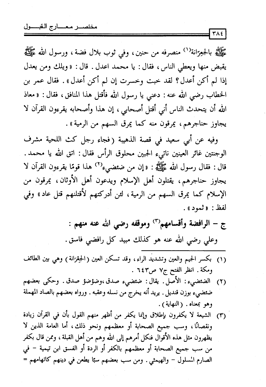 (¬3) الشيعة لا يكفرون بإطلاق وإنما يكفر من أظهر منهم القول بأن في القرآن زيادة ونقصاناً، وسب جميع الصحابة أو معظمهم ونحو ذلك، أما العامة الذين لا يظهرون مثل هذه الأقوال فنكل أمرهم إلى الله وهم من أهل القبلة، وممن قال بكفر من سب جميع الصحابة أو معظمهم بالكفر أو الردة أو الفسق ابن تيمية - في الصارم المسلول - والهيثمي. ومن سب بعضهم سباً يطعن في دينهم كاتهامهم بالكفر أو الفسق ففي تكفيره خلاف، ويرى الهيثمي تكفير من كفّر أبا بكر ونظرائه ممن شهد لهم النبي - صلى الله عليه وسلم - بالجنة - كما سيأتي في حديث العشرة المشهود لهم بالجنة ص 393.