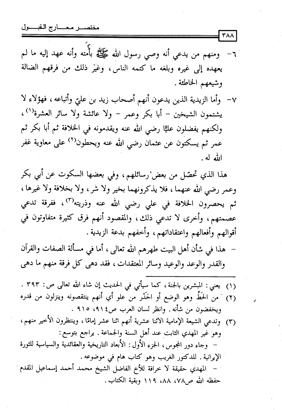 هذا الذي تحصّل من رسائلهم، وفي بعضها السكوت عن أبي بكر وعم رضي الله عنهما، فَلَا يَذْكُرُونَهُمَا بِخَيْرٍ وَلَا شَرٍّ، وَلَا بِخِلَافَةٍ وَلَا غَيْرِهَا، ثُمَّ يَحْصُرُونَ الْخِلَافَةَ فِي عَلِيٍّ رَضِيَ اللَّهُ عَنْهُ وَذُرِّيَّتِهِ (¬3) ، فَفِرْقَةٌ تَدَّعِي عِصْمَتَهُمْ وَأُخْرَى لَا تَدَّعِي ذَلِكَ، وَالْمَقْصُودُ أَنَّهُمْ فِرَقٌ كَثِيرَةٌ مُتَفَاوِتُونَ فِي أَقْوَالِهِمْ وَأَفْعَالِهِمْ وَاعْتِقَادَاتِهِمْ، وَأَخَفُّهُمْ بدعة الزيدية.