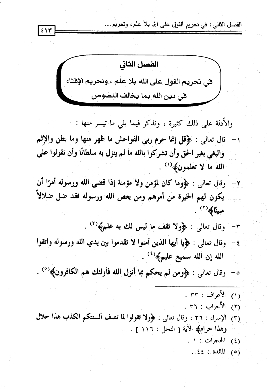 1-قَالَ تَعَالَى: {قُلْ إِنَّمَا حَرَّمَ رَبِّيَ الْفَوَاحِشَ مَا ظَهَرَ مِنْهَا وَمَا بَطَنَ وَالْإِثْمَ وَالْبَغْيَ بِغَيْرِ الْحَقِّ وَأَنْ تُشْرِكُوا بِاللَّهِ مَا لَمْ يُنَزِّلْ بِهِ سُلْطَانًا وَأَنْ تَقُولُوا عَلَى اللَّهِ ما لا تعلمون} (¬1) .