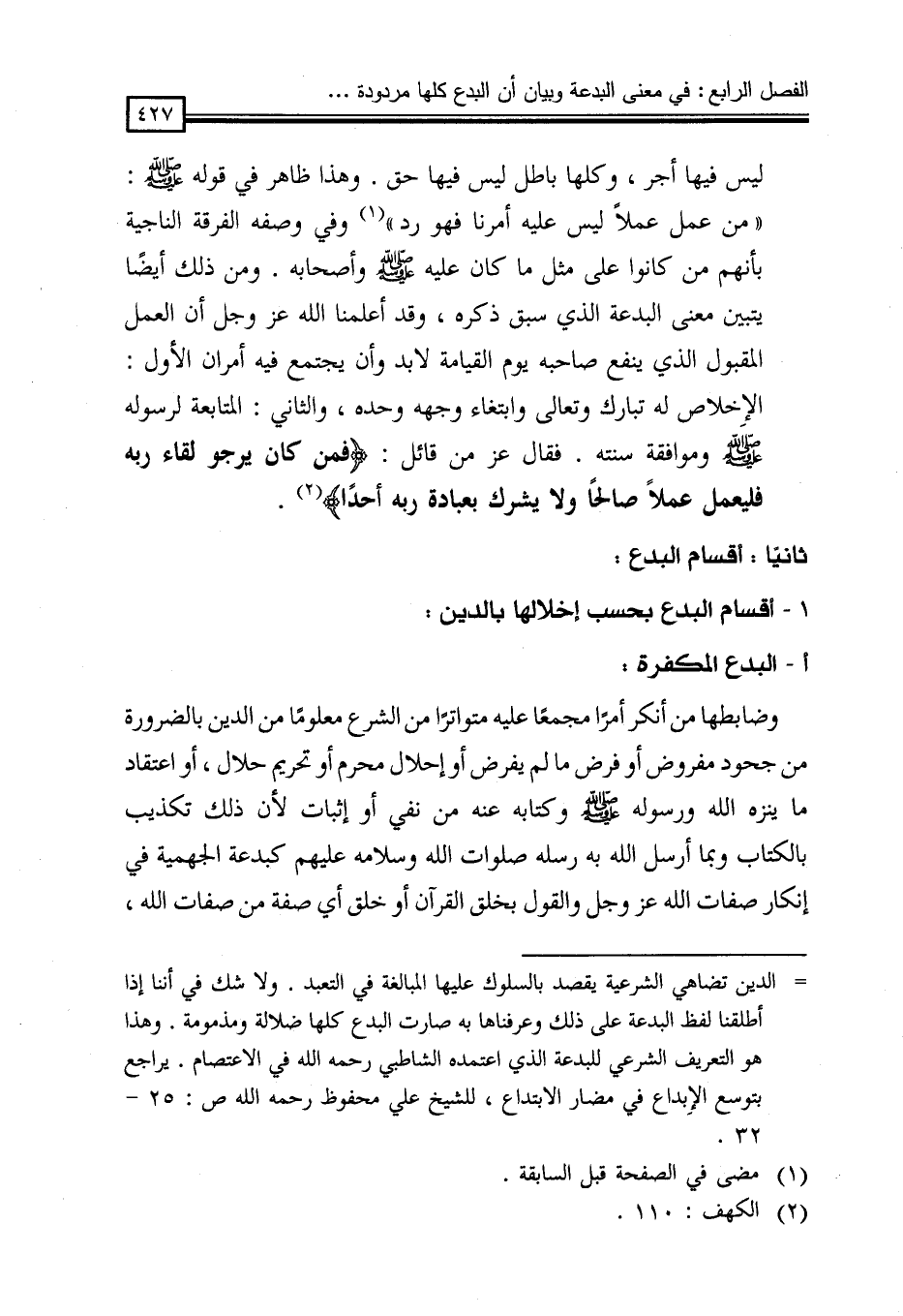 لَيْسَ فِيهَا أَجْرٌ، وَكُلَّهَا بَاطِلٌ لَيْسَ فِيهَا حق. وهذا ظاهر في قوله - صلى الله عليه وسلم -: (مَنْ عَمِلَ عَمَلًا لَيْسَ عَلَيْهِ أَمَرُنَا فَهُوَ رد) (¬1) وفي وصفه الفرقة الناجية بأنهم من كانوا على مثل ما كان عليه - صلى الله عليه وسلم - وأصحابه.