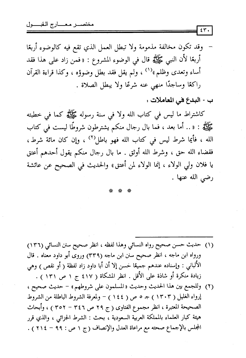 كَاشْتِرَاطِ مَا لَيْسَ فِي كِتَابِ اللَّهِ وَلَا فِي سُنَّةِ رَسُولِهِ - صَلَّى اللَّهُ عليه وسلم - كما في خطبته - صلى الله عليه وسلم -: (.. أَمَّا بَعْدُ، فَمَا بَالُ رِجَالٍ مِنْكُمْ يَشْتَرِطُونَ شُرُوطًا لَيْسَتْ فِي كِتَابِ اللَّهِ، فَأَيُّمَا شَرْطٍ فِي كِتَابِ اللَّهِ فَهُوَ بَاطِلٌ (¬2) ، وَإِنْ كَانَ مِائَةَ شَرْطٍ، فَقَضَاءُ اللَّهِ حَقٌّ، وَشَرْطُ اللَّهِ أَوْثَقُ. مَا بَالُ رِجَالٍ مِنْكُمْ يَقُولُ أَحَدُهُمْ أَعْتِقْ يَا فُلَانُ وَلِي الْوَلَاءُ، إِنَّمَا الْوَلَاءُ لمن أعتق) والحديث فِي الصَّحِيحِ عَنْ عَائِشَةَ رَضِيَ اللَّهُ عَنْهَا.