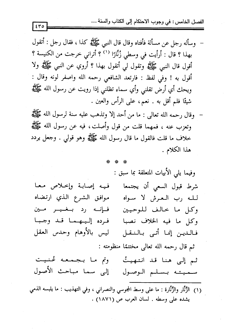 -وسأله رجل عن مسألة فأفتاه وقال النَّبِيُّ - صَلَّى اللَّهُ عَلَيْهِ وَسَلَّمَ - كَذَا، فَقَالَ رجل: أَتَقُولُ بِهَذَا؟ قَالَ: أَرَأَيْتَ فِي وَسَطِي زُنَّاراً (¬1) ؟ أَتُرَانِي خَرَجْتُ مِنَ الْكَنِيسَةِ؟ أَقُولُ قَالَ النَّبِيُّ - صلى الله عليه وسلم - وتقول لي أتقول بِهَذَا؟ أَرْوِي عَنِ النَّبِيِّ - صَلَّى اللَّهُ عَلَيْهِ وَسَلَّمَ - وَلَا أَقُولُ بِهِ! وَفِي لَفْظٍ: فَارْتَعَدَ الشَّافِعِيُّ رَحِمَهُ اللَّهُ وَاصْفَرَّ لَوْنُهُ وَقَالَ: وَيْحَكَ أَيُّ أَرْضٍ تُقِلُّنِي وَأَيُّ سَمَاءٍ تُظِلُّنِي إِذَا رَوَيْتُ عَنْ رَسُولِ اللَّهِ - صَلَّى اللَّهُ عَلَيْهِ وَسَلَّمَ - شيئاً لم أقل به. نعم، على الرأس والعين.