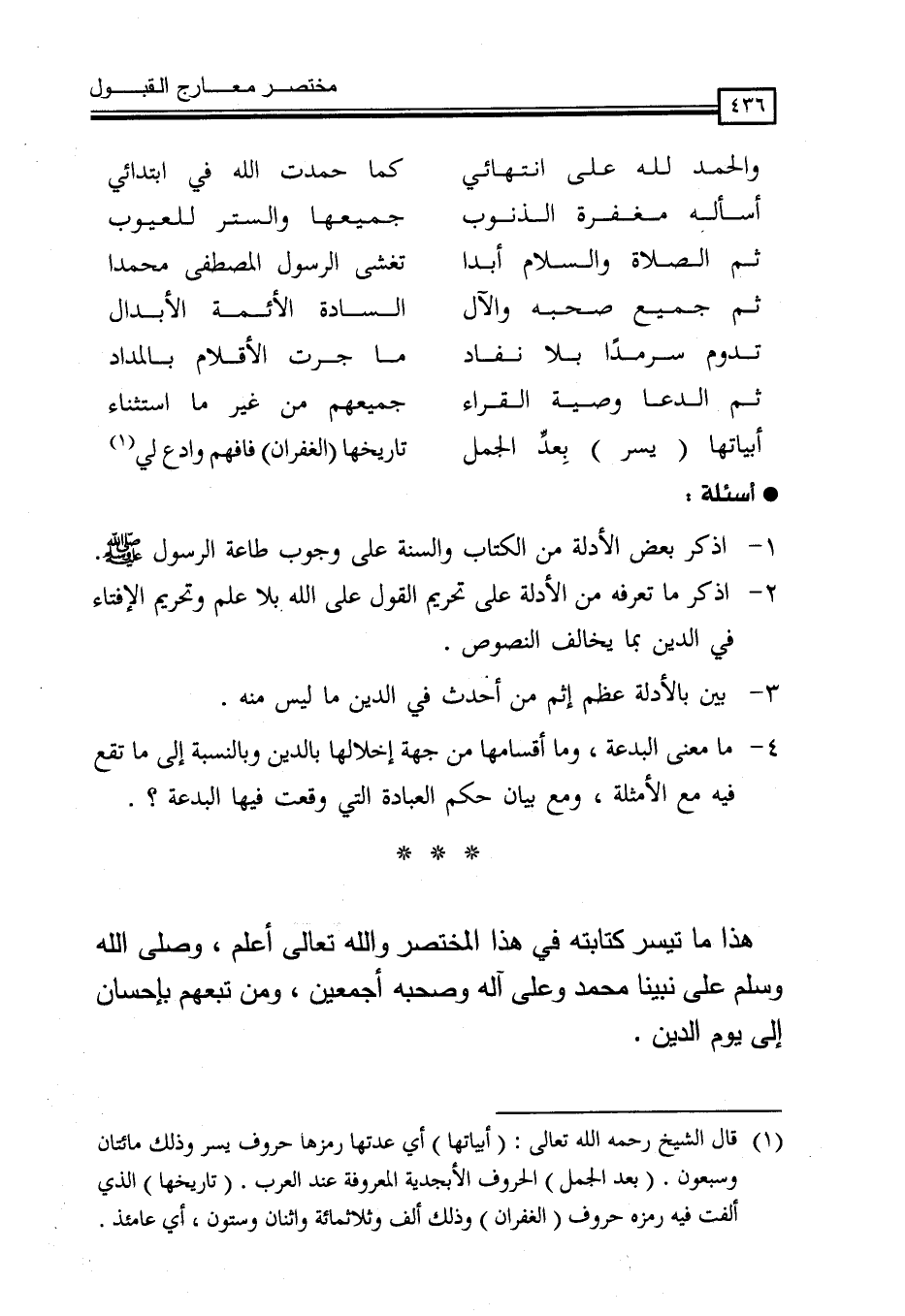 (¬1) قال الشيخ رحمه الله تعالى: (أبياتها) أي عدتها رمزها حُرُوفِ يُسْرٌ وَذَلِكَ مِائَتَانِ وَسَبْعُونَ. (بِعَدِّ الْجُمَّلِ) الحروف الأبجدية المعروفة عند العرب. (تَأْرِيخُهَا) الَّذِي أُلِّفَتْ فِيهِ رَمْزُهُ حُرُوفُ (الْغُفْرَانُ) وَذَلِكَ أَلْفٌ وَثَلَاثُمِائَةٍ وَاثْنَانِ وَسِتُّونَ، أَيْ عَامَئِذٍ.
