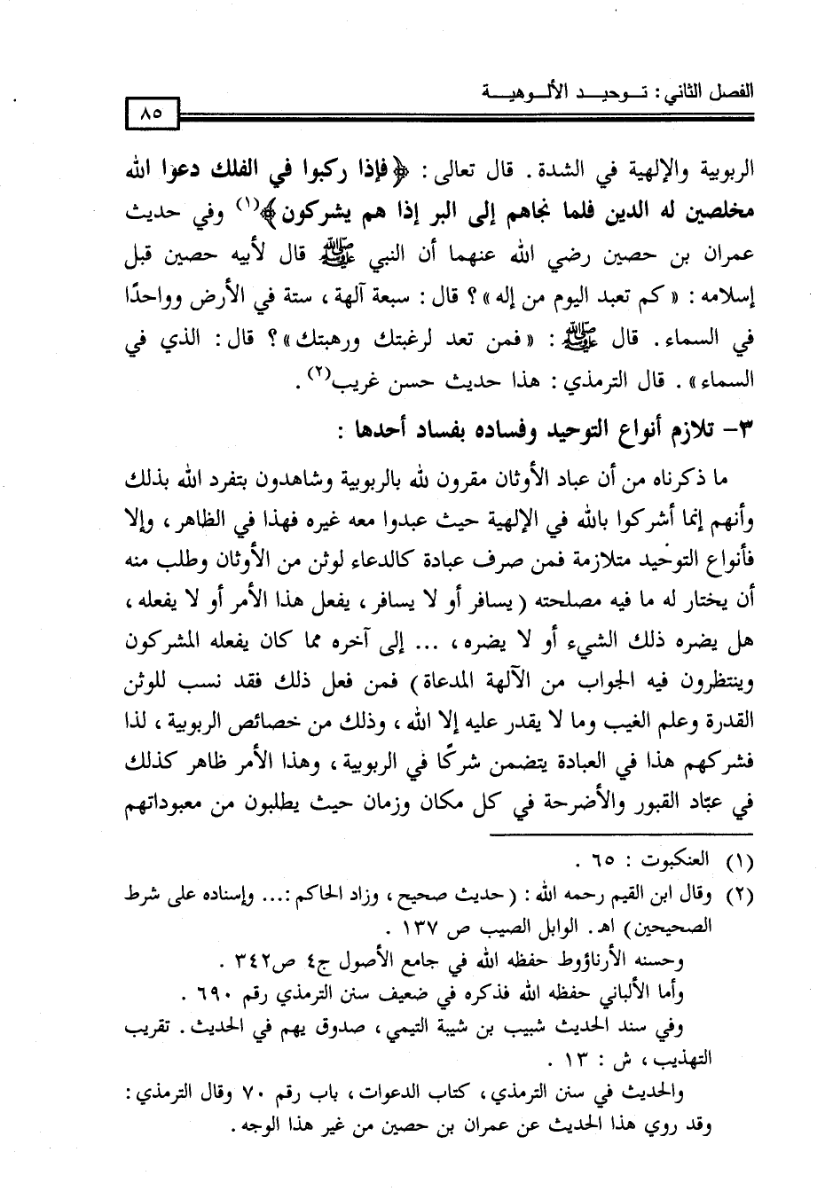 الربوبية والإلهية في الشدة. قَالَ تَعَالَى: {فَإِذَا رَكِبُوا فِي الْفُلْكِ دَعَوُا اللَّهَ مُخْلِصِينَ لَهُ الدِّينَ فَلَمَّا نَجَّاهُمْ إِلَى البر إذا هم يشركون} (¬1) وفي حَدِيثُ عِمْرَانَ بْنِ حُصَيْنٍ رَضِيَ اللَّهُ عَنْهُمَا أَنَّ النَّبِيَّ - صَلَّى اللَّهُ عَلَيْهِ وَسَلَّمَ - قَالَ لِأَبِيهِ حُصَيْنٍ قَبْلَ إِسْلَامِهِ: (كَمْ تَعْبُدُ الْيَوْمَ مِنْ إِلَهٍ) ؟ قَالَ: سَبْعَةَ آلِهَةٍ، سِتَّةً فِي الْأَرْضِ وَوَاحِدًا فِي السَّمَاءِ. قَالَ - صَلَّى اللَّهُ عَلَيْهِ وَسَلَّمَ -: (فَمَنْ تُعِدُّ لِرَغْبَتِكَ وَرَهْبَتِكَ) ؟ قَالَ: الذي في السماء) . قال الترمذي: هذا حديث حسن غريب (¬2) .