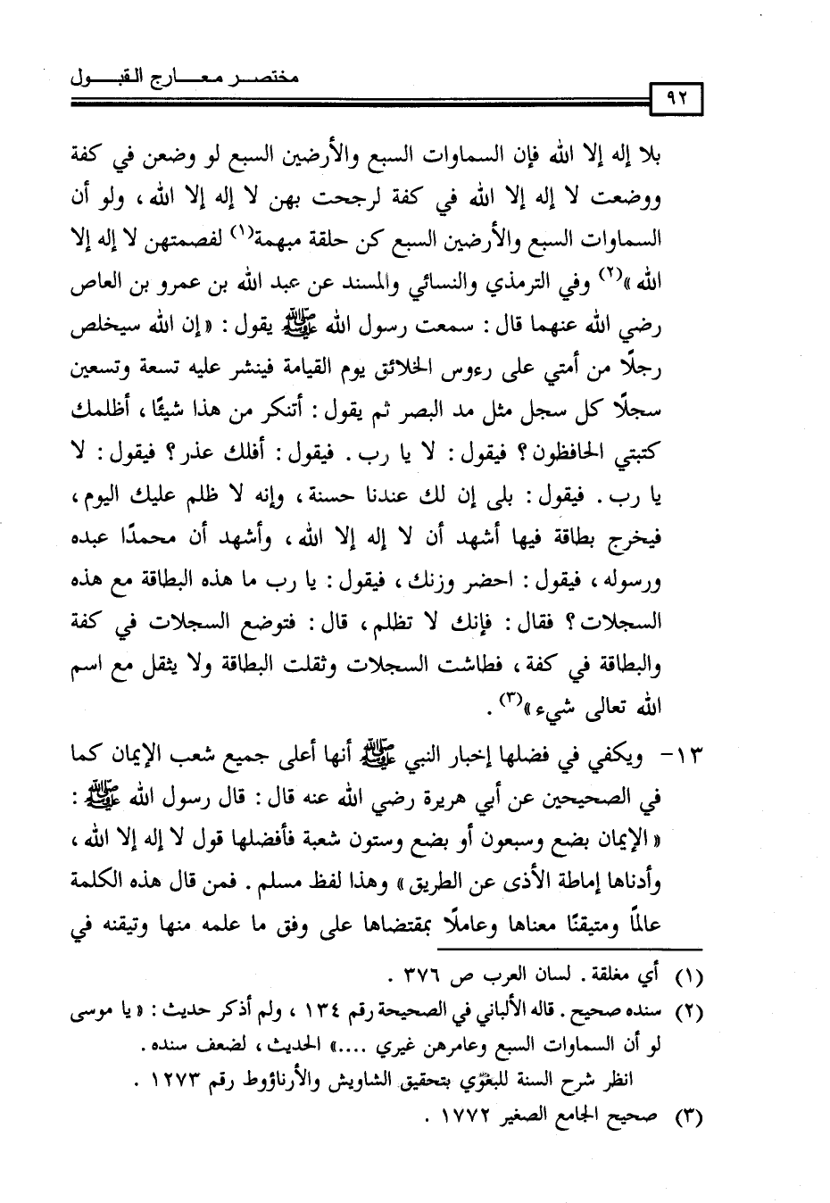 وفي الترمذي والنسائي والمسند عَنْ عَبْدِ اللَّهِ بْنِ عَمْرِو بْنِ الْعَاصِ رضي الله عنهما قال: سمعت رسول الهل - صَلَّى اللَّهُ عَلَيْهِ وَسَلَّمَ - يَقُولُ: (إِنَّ اللَّهَ سَيُخَلِّصُ رَجُلًا مِنْ أُمَّتِي عَلَى رُءُوسِ الْخَلَائِقِ يَوْمَ الْقِيَامَةِ فَيَنْشُرُ عَلَيْهِ تِسْعَةً وَتِسْعِينَ سِجِلًّا كُلُّ سِجِلٍّ مِثْلُ مَدِّ الْبَصَرِ ثُمَّ يَقُولُ: أَتُنْكِرُ مِنْ هَذَا شَيْئًا، أَظْلَمَكَ كَتَبَتِي الْحَافِظُونَ؟ فيقول: لا يارب. فيقول: أفلك عذر؟ فيقول: لا يارب. فَيَقُولُ: بَلَى إِنَّ لَكَ عِنْدَنَا حَسَنَةً، وَإِنَّهُ لَا ظُلْمَ عَلَيْكَ الْيَوْمَ، فَيُخْرِجُ بِطَاقَةً فِيهَا أشهد أن لا إله اللَّهُ، وَأَشْهَدُ أَنَّ مُحَمَّدًا عَبْدُهُ وَرَسُولُهُ، فَيَقُولُ: احضر وزنك، فيقول: يارب مَا هَذِهِ الْبِطَاقَةُ مَعَ هَذِهِ السِّجِلَّاتِ؟ فَقَالَ: فإنك لا تظلم، قال: فتوضع السِّجِلَّاتُ وَثَقُلَتِ الْبِطَاقَةُ وَلَا يَثْقُلُ مَعَ اسْمِ الله تعالى شيء) (¬3) .