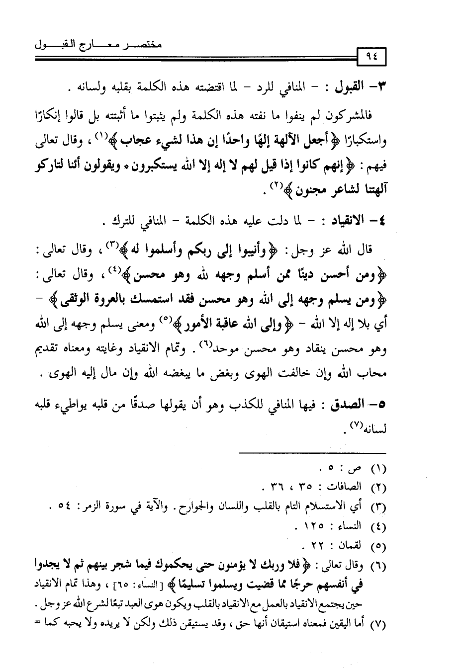 (¬6) وَقَالَ تَعَالَى: {فَلَا وَرَبِّكَ لَا يُؤْمِنُونَ حَتَّى يُحَكِّمُوكَ فِيمَا شَجَرَ بَيْنَهُمْ ثُمَّ لَا يَجِدُوا فِي أَنْفُسِهِمْ حَرَجًا مِمَّا قَضَيْتَ وَيُسَلِّمُوا تَسْلِيمًا} [النِّسَاءِ: 65] ، وهذا تمام الانقياد حين يجتمع الانقياد بالعمل مع الانقياد بالقلب ويكون هوى العبد تبعاً لشرع الله عز وجل.