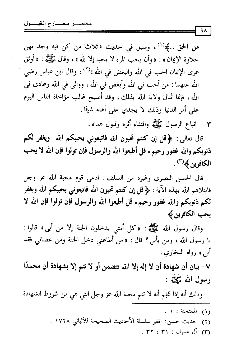قال تَعَالَى: {قُلْ إِنْ كُنْتُمْ تُحِبُّونَ اللَّهَ فَاتَّبِعُونِي يُحْبِبْكُمُ اللَّهُ وَيَغْفِرْ لَكُمْ ذُنُوبَكُمْ وَاللَّهُ غَفُورٌ رَحِيمٌ * قُلْ أَطِيعُوا اللَّهَ وَالرَّسُولَ فَإِنْ تَوَلَّوْا فَإِنَّ الله لا يحب الكافرين} (¬3) .