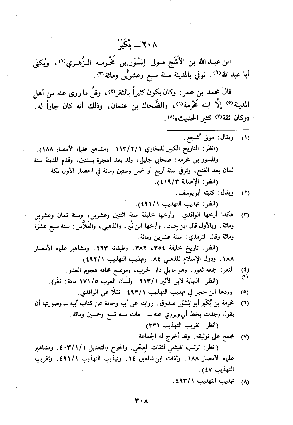 6 مخرمة بن بكير أبو المسور صدوق. روايته عن أبيه وجادة عن كتاب أبيه -وصورتها يقول: وجدت بخط أبي يروي عنه-. مات سنة تسع وخمسين ومائة. (انظر: تقريب التهذيب 331) .