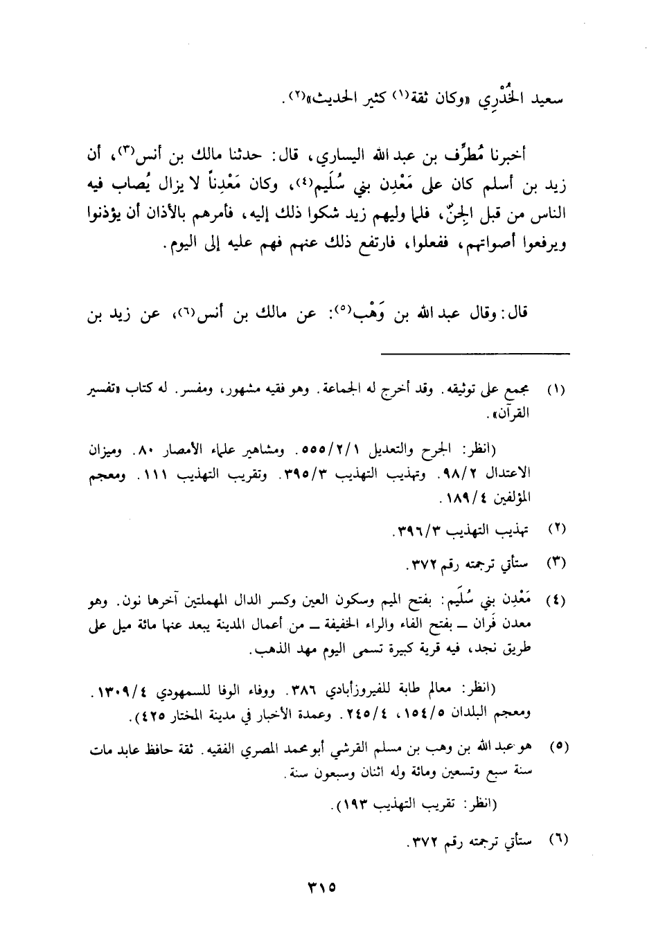 أَخْبَرَنَا مطرَّف بن عبدا لله الْيَسَارِيُّ، قَالَ: حَدَّثَنَا مَالِكُ بْنُ أَنَسٍ3، أَنَّ زَيْدَ بْنَ أَسْلَمَ كَانَ عَلَى مَعْدِن بَنِي سُليم4، وَكَانَ مَعْدِناً لَا يَزَالُ يُصاب فِيهِ النَّاسُ مِنْ قِبَلِ الْجِنِّ، فَلَمَّا وَلِيَهُمْ زَيْدٌ شَكَوْا ذَلِكَ إِلَيْهِ، فَأَمَرَهُمْ بِالْأَذَانِ أَنْ يُؤَذِّنُوا وَيَرْفَعُوا أَصْوَاتَهُمْ، فَفَعَلُوا، فَارْتَفَعَ ذَلِكَ عَنْهُمْ فَهُمْ عليه إلى اليوم.