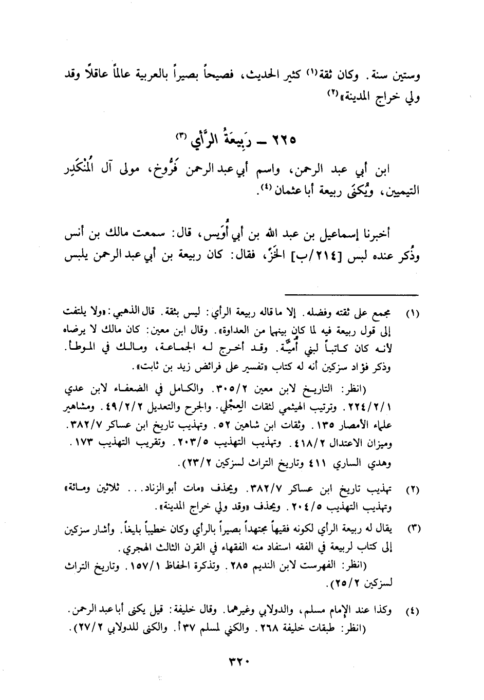 3 يقال له ربيعة الرأي لكونه فقيهاً مجتهداً بصيراً بالرأي وكان خطيباً بليغاً. وأشار سزكين إلى كتاب لربيعة في الفقه استفاد منه الفقهاء في القرن الثالث الهجري. (انظر: الفهرست لابن النديم 285. وتذكرة الحفاظ 1/157. وتاريخ التراث لسزكين 2/25) .