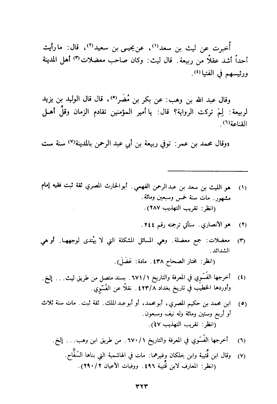 أُخْبِرْتُ عَنْ لَيْثِ بْنِ سَعْدٍ1، عَنْ يَحْيَى بْنِ سَعِيدٍ2، قَالَ: "مَا رَأَيْتُ أَحَدًا أَشَدَّ عَقْلًا مِنْ رَبِيعَةَ". قَالَ لَيْثٌ: "وَكَانَ صَاحِبَ مُعْضِلَاتِ3 أَهْلِ الْمَدِينَةِ وَرَئِيسَهُمْ فِي الْفُتْيَا"4. وَقَالَ عَبْدُ اللَّهِ بْنُ وَهْبٍ عَنْ بَكْرِ بْنِ مُضَر5، قَالَ قَالَ الْوَلِيدُ بْنُ يَزِيدَ لِرَبِيعَةَ: "لِمَ تَرَكْتَ الرِّوَايَةَ؟ " قَالَ: "يَا أَمِيرَ الْمُؤْمِنِينَ تَقَادَمَ الزَّمَانُ وقلَّ أَهْلُ الْقَنَاعَةِ"6.