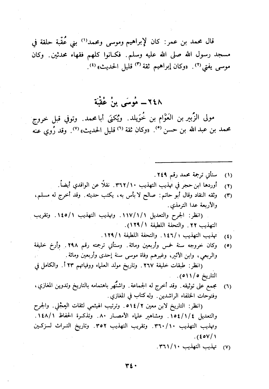 6 مجمع على توثيقه. وقد أخرج له الجماعة واشتهر باهتمامه بالتاريخ وتدوين المغازي، وفتوحات الخلفاء الراشدين. وله كتاب في المغازي. (انظر: التاريخ لابن معين 2/514. وترتيب الهيثمي لثقات العجلي. والجرح والتعديل 4/1/154. ومشاهير علماء الأمصار 80. وتذكرة الحفاظ 1/148. وتهذيب التهذيب 10/360. وتقريب التهذيب 352. وتاريخ التراث لسزكين 1/457) .