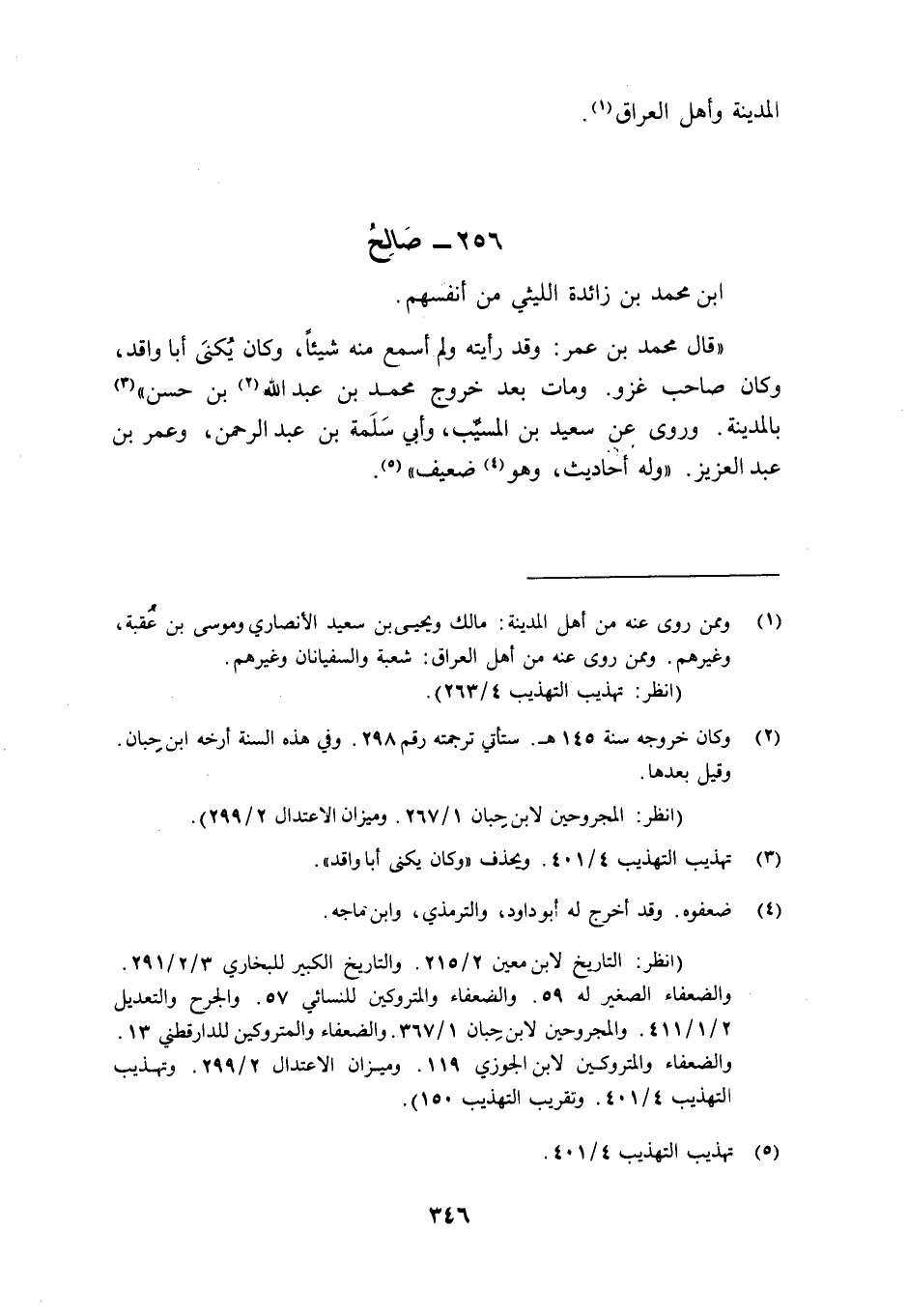 قَالَ مُحَمَّدُ بْنُ عُمَرَ: "وَقَدْ رَأَيْتُهُ وَلَمْ أَسْمَعْ مِنْهُ شَيْئًا، وَكَانَ يُكْنَى أَبَا وَاقِدٍ، وَكَانَ صَاحِبَ غَزْوٍ. وَمَاتَ بَعْدَ خُرُوجِ مُحَمَّدِ بْنِ عَبْدِ اللَّهِ2 بْنِ حَسَنٍ3 بِالْمَدِينَةِ". وَرَوَى عَنْ سَعِيدِ بْنِ الْمُسَيِّبِ، وَأَبِي سَلَمَةَ بْنِ عَبْدِ الرَّحْمَنِ، وَعُمَرَ بْنِ عَبْدِ الْعَزِيزِ. وَلَهُ أَحَادِيثُ، وهو4 ضعيف5.