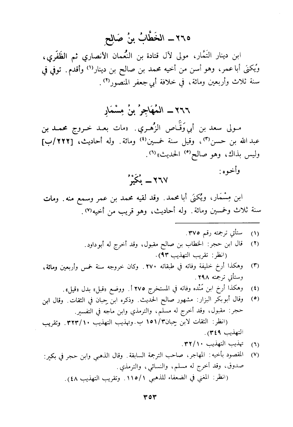 7 المقصود بأخيه: المهاجر، صاحب الترجمة السابقة. وقال الذهبي وابن حجر في بكير: "صدوق، وقد أخرج له مسلم، والنسائي، والترمذي" (انظر: المغني في الضعفاء للذهبي 1/115. وتقريب التهذيب 48) .