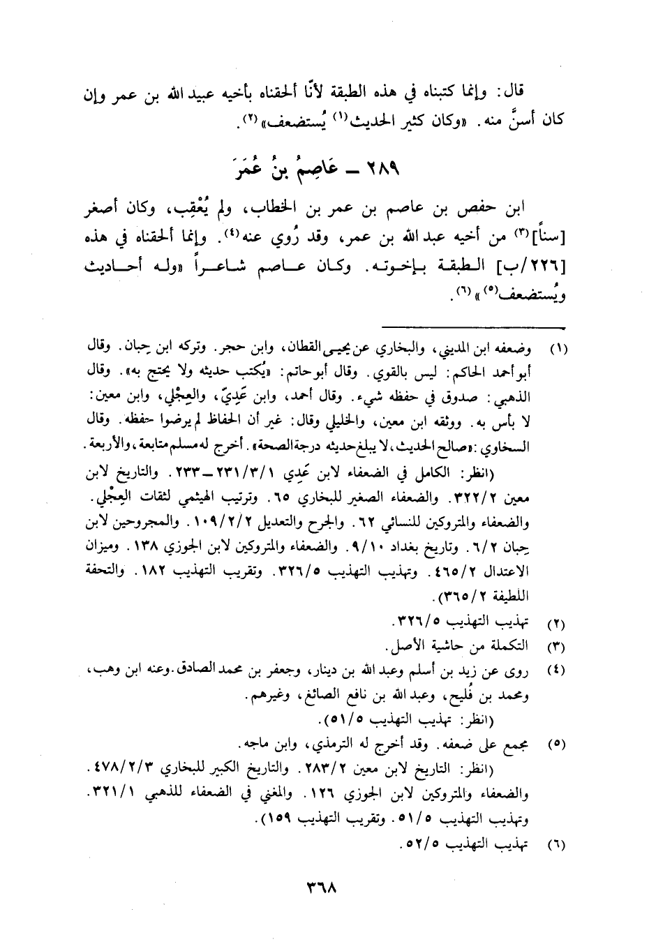 قَالَ: "وَإِنَّمَا كَتَبْنَاهُ فِي هَذِهِ الطَّبَقَةِ لَأَنَّا أَلْحَقْنَاهُ بِأَخِيهِ عُبَيْدِ اللَّهِ بْنَ عُمَرَ وَإِنْ كَانَ أسنَّ مِنْهُ. (وَكَانَ كَثِيرَ الْحَدِيثِ1 يُسْتَضْعَفُ"2.