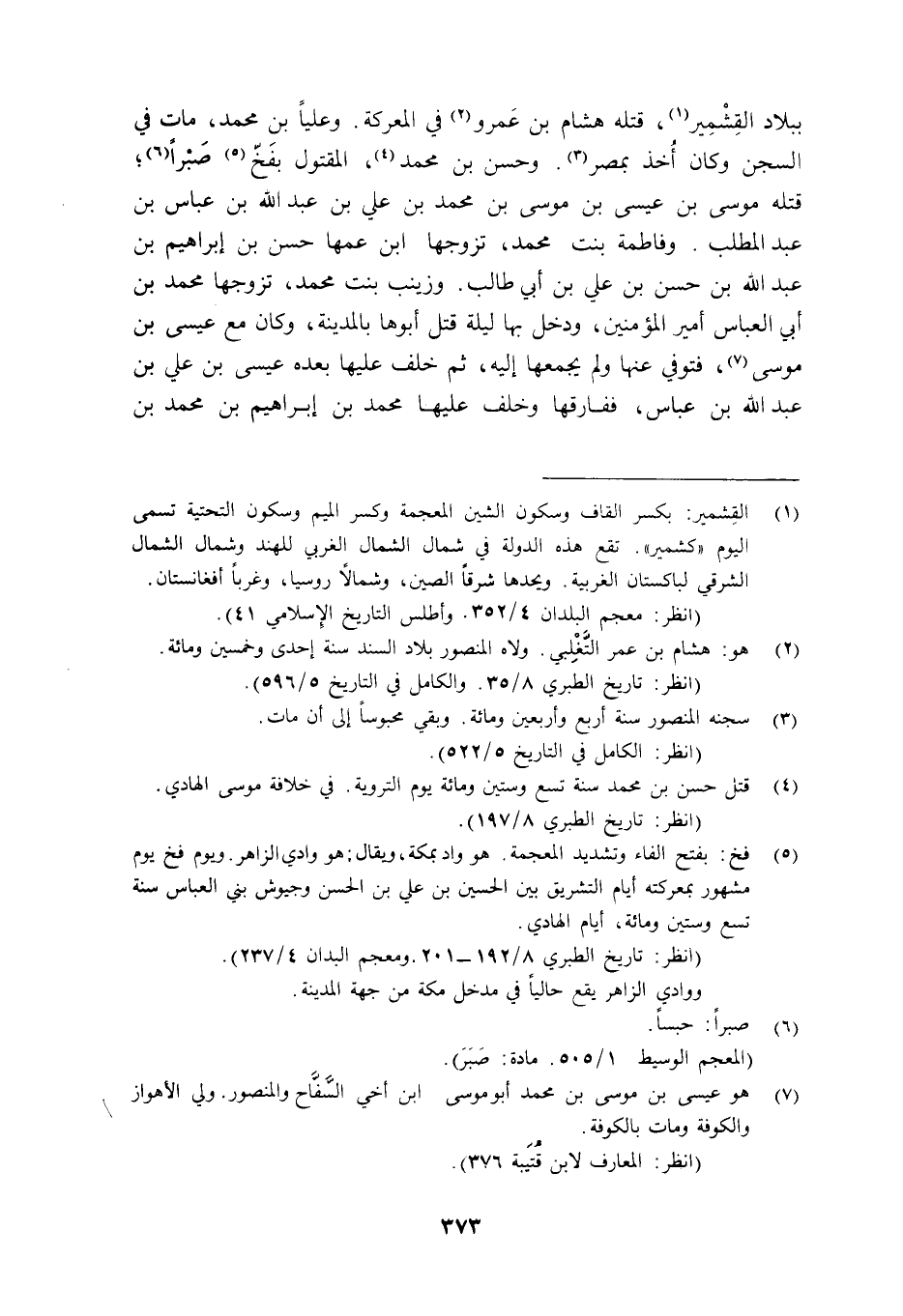 ببلاد القِشْمِير1 قتله هشام بن عَمرو2 في المعركة. وعلياً بْنَ مُحَمَّدٍ، مَاتَ فِي السِّجْنِ وَكَانَ أُخذ بِمِصْرَ3. وَحَسَنَ بْنَ مُحَمَّدٍ4، الْمَقْتُولَ بِفَخٍّ5 صَبْرًا6؛ قَتَلَهُ مُوسَى بْنُ عِيسَى بْنِ مُوسَى بْنِ محمد بن علي بن عبد الله بن عَبَّاسِ بْنِ عَبْدِ الْمُطَّلِبِ. وَفَاطِمَةَ بِنْتَ مُحَمَّدٍ، تَزَوَّجَهَا ابْنُ عَمِّهَا حَسَنُ بْنُ إِبْرَاهِيمَ بْنِ عَبْدِ اللَّهِ بْنِ حَسَنِ بْنِ عَلِيِّ بْنِ أَبِي طَالِبٍ. وَزَيْنَبَ بِنْتَ، مُحَمَّدٍ تَزَوَّجَهَا مُحَمَّدُ بْنُ أَبِي الْعَبَّاسِ أَمِيرُ الْمُؤْمِنِينَ، وَدَخَلَ بِهَا ليلة قتل أَبَوْهَا بِالْمَدِينَةِ، وَكَانَ مَعَ عِيسَى بْنِ مُوسَى7، فَتُوُفِّيَ عَنْهَا وَلَمْ يَجْمَعْهَا إِلَيْهِ، ثُمَّ خَلَفَ عَلَيْهَا بَعْدَهُ عِيسَى بْنُ عَلِيِّ بْنِ عَبْدِ اللَّهِ بْنِ عَبَّاسٍ، فَفَارَقَهَا وَخَلَفَ عَلَيْهَا مُحَمَّدُ بن إبراهيم بن محمد بن