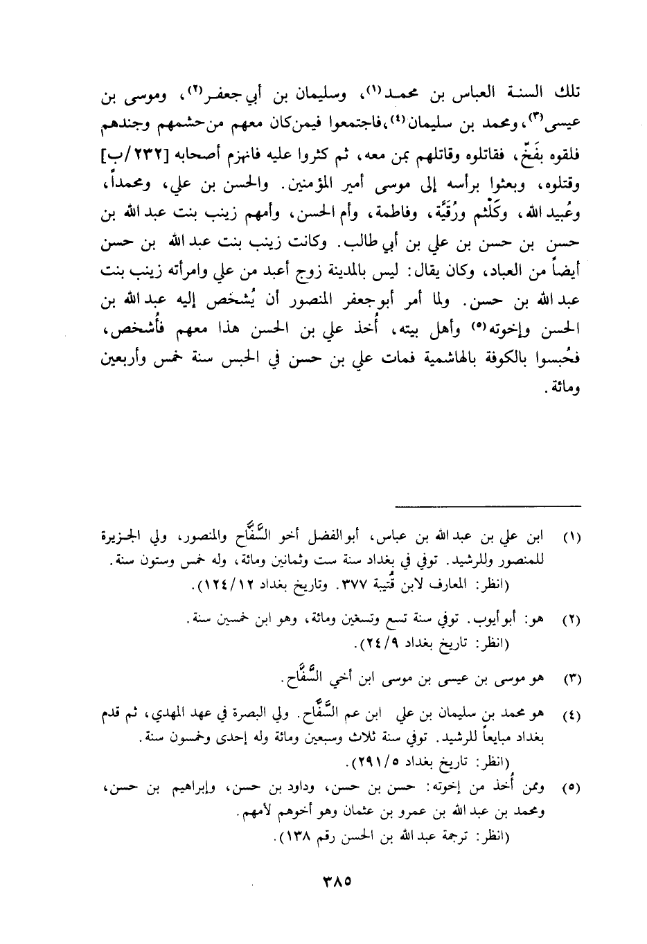 تِلْكَ السَّنَةِ الْعَبَّاسُ بْنُ مُحَمَّدٍ1، وَسُلَيْمَانُ بْنُ أبي جعفر 2، وموسى بن عيسى3، ومحمد ابن سُلَيْمَانَ4، فَاجْتَمَعُوا فِيمَنْ كَانَ مَعَهُمْ مِنْ حَشَمِهِمْ وَجُنْدِهِمْ فَلَقَوْهُ بِفَخٍّ، فَقَاتَلُوهُ وَقَاتَلْهُمْ بِمَنْ مَعَهُ، ثم كثروا عليه فانهزم أصحابه [232/ب] وَقَتَلُوهُ، وَبَعَثُوا بِرَأْسِهِ إِلَى مُوسَى أَمِيرِ الْمُؤْمِنِينَ. وَالْحَسَنِ بْنِ عَلِيٍّ، وَمُحَمَّدًا، وَعُبَيْدَ اللَّهِ، وَكَلْثَمَ، ورقيَّة، وَفَاطِمَةَ، وَأُمَّ الْحَسَنِ. وَأُمُّهُمْ زَيْنَبُ بِنْتُ عبد الله بن حسن بن حسن بن عَلِيِّ بْنِ أَبِي طَالِبٍ. وَكَانَتْ زَيْنَبُ بِنْتُ عَبْدِ اللَّهِ بْنِ حَسَنٍ أَيْضًا مِنَ الْعُبَّادِ، وَكَانَ يُقَالُ: "لَيْسَ بِالْمَدِينَةِ زَوْجٌ أَعْبَدُ مِنْ علي وامرأته زينب بنت عبد الله ابن حَسَنٍ". وَلَمَّا أَمَرَ أَبُو جَعْفَرٍ الْمَنْصُورُ أَنْ يُشخص إِلَيْهِ عَبْدُ اللَّهِ بْنُ الْحَسَنِ وَإِخْوَتُهُ5 وَأَهْلُ بَيْتِهِ، أُخذ عَلِيَّ بْنَ الْحَسَنِ هَذَا مَعَهُمْ فأُشخص، فَحُبِسُوا بِالْكُوفَةِ بِالْهَاشِمِيَّةِ فَمَاتَ عَلِيُّ بْنُ حَسَنٍ فِي الْحَبْسِ سَنَةَ خَمْسٍ وَأَرْبَعِينَ ومائة.