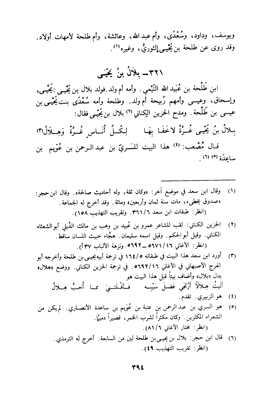 3 أورد ابن سعد هذا البيت في طبقاته 5/164. في ترجمة أبيه يحيى بن طلحة وأخرجه أبو الفرج الأصبهاني في الأغاني 16/5692. في ترجمة الحزين الكناني. ووضع (هلال) بدل (بلال) وأضاف بيتاً قبل هذا البيت هو