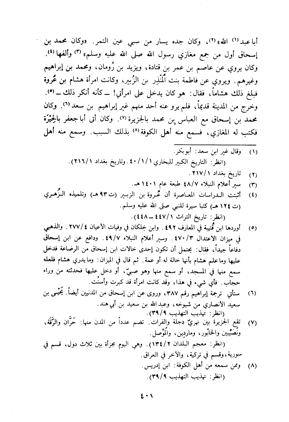 أَبَا عَبْدِ1 اللَّهِ) 2، وَكَانَ جَدُّهُ يَسَارٌ مِنْ سبي عين التمر. (وكان محمد ابن إِسْحَاقَ أَوَّلَ مَنْ جَمَعَ مَغَازِيَ رَسُولِ اللَّهِ صلّى الله عليه وسلم) 3 وَأَلَّفَهَا4. وَكَانَ يَرْوِي عَنْ عَاصِمِ بْنِ عُمَرَ بْنِ قَتَادَةَ، وَيَزِيدَ بْنِ رُومان، وَمُحَمَّدِ بْنِ إِبْرَاهِيمَ، وَغَيْرِهِمْ. وَيَرْوِي عَنْ فَاطِمَةَ بِنْتِ الْمُنْذِرِ بْنِ الزُّبَيْرِ، وَكَانَتِ امْرَأَةُ هِشَامِ بْنِ عُرْوَةَ فَبَلَغَ ذَلِكَ هِشَامًا، فَقَالَ: هُوَ كَانَ يَدْخُلُ عَلَى امْرَأَتِي! -كَأَنَّهُ أَنْكَرَ ذَلِكَ-5. وَخَرَجَ مِنَ الْمَدِينَةِ قَدِيمًا، فَلَمْ يَرْوِ عَنْهُ أَحَدٌ مِنْهُمْ غَيْرُ إِبْرَاهِيمَ بْنِ سَعْدٍ6. وَكَانَ مُحَمَّدُ بْنُ إِسْحَاقَ مَعَ الْعَبَّاسِ بْنِ مُحَمَّدٍ بِالْجَزِيرَةِ7. وَكَانَ أَتَى أَبَا جَعْفَرٍ بِالْحِيرَةِ فَكَتَبَ لَهُ الْمَغَازِيَ، فَسَمِعَ مِنْهَ أَهْلُ الكوفة8 بذلك السبب. وسمع منه أهل