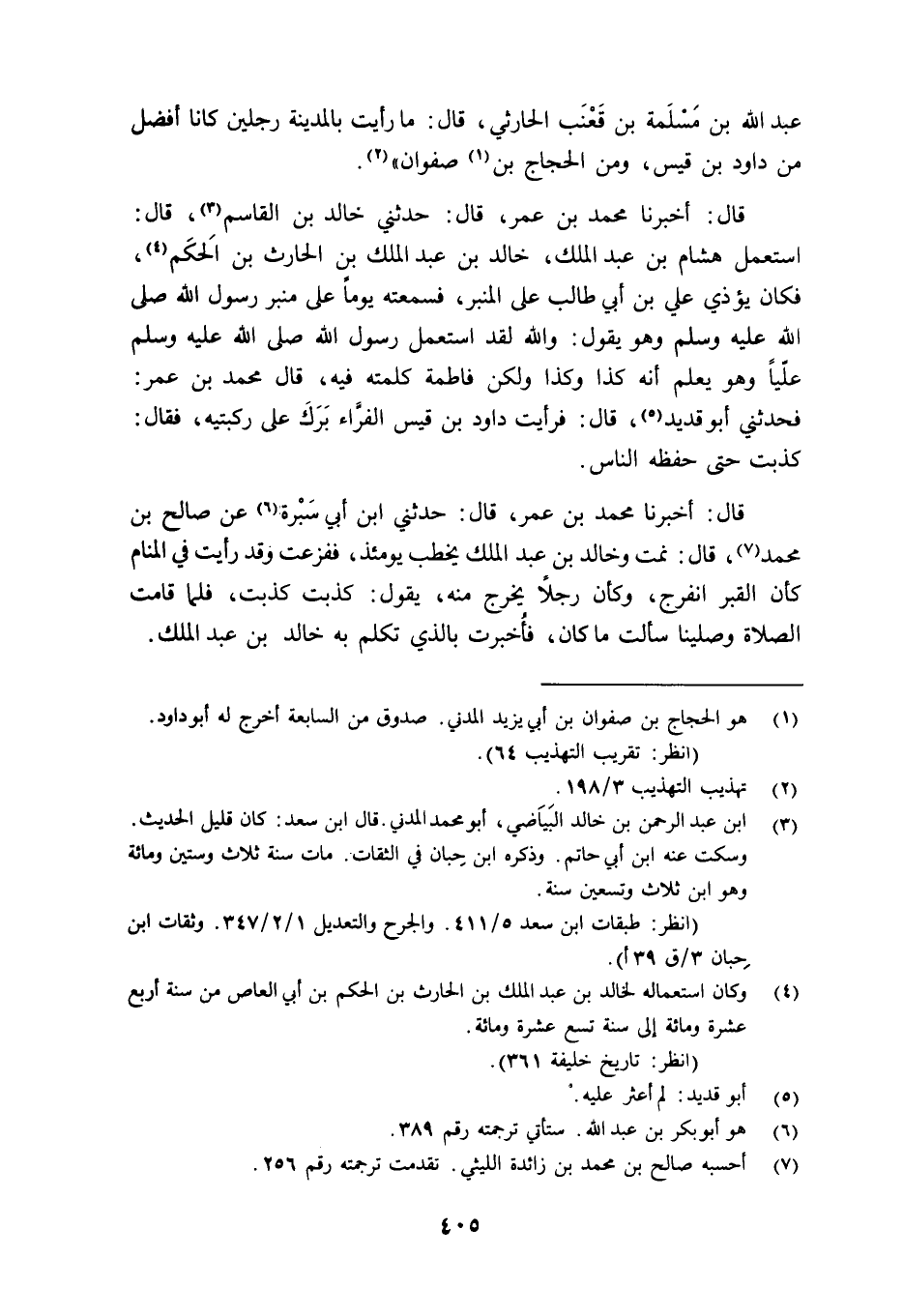 عَبْدُ اللَّهِ بْنُ مَسْلَمَةَ بْنِ قَعْنَب الْحَارِثِيُّ، قَالَ: "مَا رَأَيْتُ بِالْمَدِينَةِ رَجُلَيْنِ كَانَا أَفْضَلَ مِنْ دَاوُدَ بْنِ قَيْسٍ، وَمِنِ الْحَجَّاجِ بْنِ1 صَفْوَانَ"2.