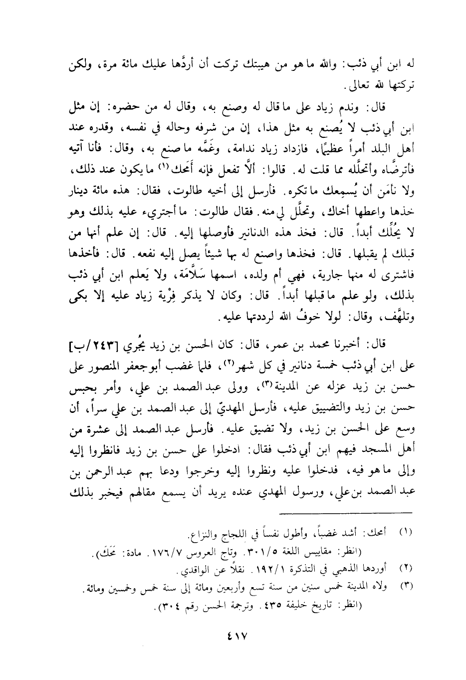 قَالَ: أَخْبَرَنَا مُحَمَّدُ بْنُ عُمَرَ، قَالَ: "كَانَ الْحَسَنُ بْنُ زيد يُجري [243/ب] عَلَى ابْنِ أَبِي ذِئْبٍ خَمْسَةَ دَنَانِيرَ فِي كُلِّ شَهْرٍ2، فَلَمَّا غَضِبَ أَبُو جَعْفَرٍ الْمَنْصُورُ عَلَى حَسَنِ بْنِ زَيْدٍ عَزَلَهُ عَنِ الْمَدِينَةِ3، وَوَلَّى عَبْدَ الصَّمَدِ بْنَ عَلِيٍّ، وَأَمَرَ بِحَبْسِ حَسَنِ بْنِ زَيْدٍ وَالتَّضْيِيقِ عَلَيْهِ، فَأَرْسَلَ الْمَهْدِيُّ إِلَى عَبْدِ الصَّمَدِ بْنِ عَلِيٍّ سِرًّا، أَنْ وَسِّعْ عَلَى الْحَسَنِ بْنِ زَيْدٍ، وَلَا تَضَيِّقْ عَلَيْهِ فَأَرْسَلَ عَبْدُ الصَّمَدِ إِلَى عَشَرَةٍ مِنْ أَهْلِ الْمَسْجِدِ فِيهِمُ ابْنُ أَبِي ذِئْبٍ" فَقَالَ: "ادْخُلُوا عَلَى حَسَنِ بْنِ زَيْدٍ فَانْظُرُوا إِلَيْهِ وَإِلَى مَا هُوَ فِيهِ، فَدَخَلُوا عَلَيْهِ وَنَظَرُوا إِلَيْهِ وَخَرَجُوا وَدَعَا بِهِمْ عَبْدُ الرَّحْمَنِ بْنُ عَبْدِ الصَّمَدِ بْنِ عَلِيٍّ، وَرَسُولُ الْمَهْدِيِّ عِنْدَهُ يريد أن يسمع مقالهم فيخبر بذلك