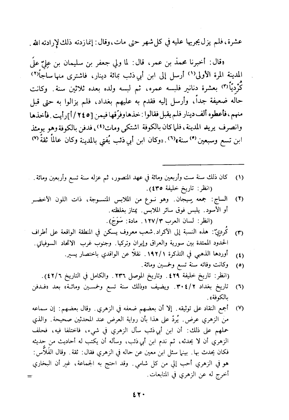(قَالَ: أَخْبَرَنَا مُحَمَّدُ بْنُ عُمَرَ، قَالَ: "لَمَّا وَلِيَ جَعْفَرُ بْنُ سُلَيْمَانَ بْنِ عليَّ عَلَى الْمَدِينَةِ الْمَرَّةَ الْأُولَى1 أَرْسَلَ إِلَى ابْنِ أَبِي ذِئْبٍ بِمِائَةِ دِينَارٍ، فَاشْتَرَى مِنْهَا سَاجًا2 كرديَّاً3 بِعَشَرَةِ دَنَانِيرَ فَلَبِسَهُ عُمْرَهُ، ثُمَّ لَبِسَهُ وَلَدُهُ بَعْدَهُ ثَلَاثِينَ سَنَةً. وَكَانَتْ حَالُهُ ضَعِيفَةً جِدًّا، وَأَرْسَلَ إِلَيْهِ فَقَدِمَ بِهِ عَلَيْهِمْ بغداد، فلم يزالوا بِهِ حَتَّى قَبِلَ مِنْهُمْ، فَأَعْطُوهُ أَلْفَ دِينَارٍ فلم يقبل فقالوا: "خذها وفرّقها فيمن [245/أ] رَأَيْتَ فَأَخَذَهَا وَانْصَرَفَ يُرِيدُ الْمَدِينَةَ، فَلَمَّا كَانَ بِالْكُوفَةِ اشْتَكَى وَمَاتَ4، فَدُفِنَ بِالْكُوفَةِ وَهُوَ يَوْمَئِذٍ ابْنُ تِسْعٍ وَسَبْعِينَ5 سَنَةً) 6. وَكَانَ ابْنُ أَبِي ذئب يُفتي بالمدينة وكان عالماً ثقةً7