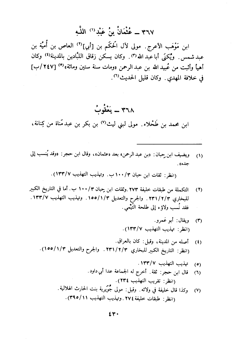 2 التكملة من طبقات خليفة 273. وثقات ابن حبان 3/100ب. أما في التاريخ الكبير للبخاري 3/2/231. والجرح والتعديل 3/1/155. وتهذيب التهذيب 7/133. فقد نُسب ولاؤه إلى طلحة التيمي.
