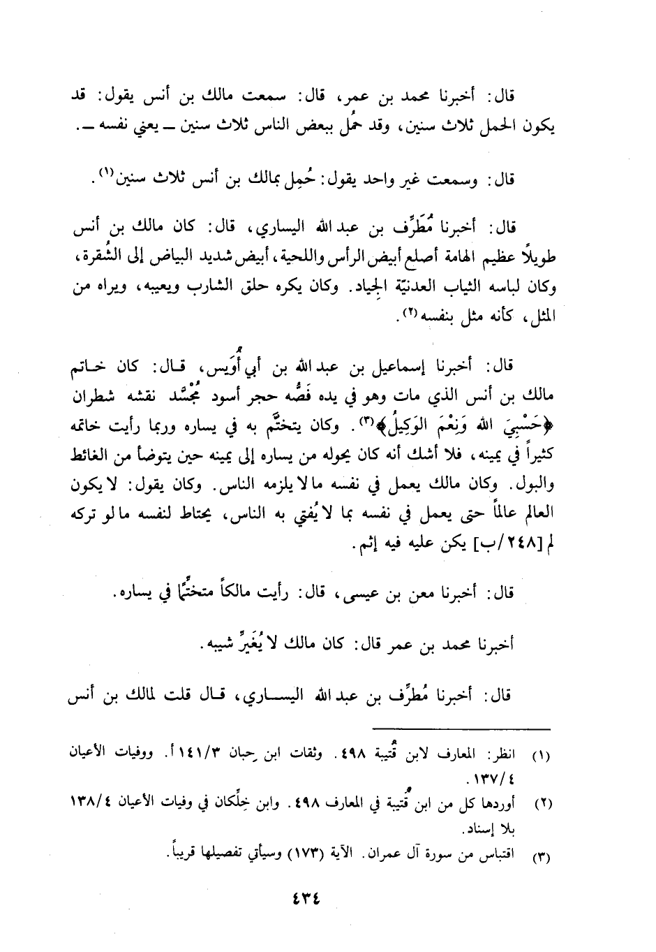 قَالَ: أخبرنا إسماعيل بن عبد الله بن أبي أُوَيْسٍ، قَالَ: "كَانَ خَاتَمُ مَالِكِ بْنِ أَنَسٍ الَّذِي مَاتَ وَهُوَ فِي يَدِهِ فَصُه حَجَرٌ أَسْوَدُ مُجْسَد نَقْشُهُ شَطْرَانِ {حَسْبِيَ اللَّهُ وَنِعْمَ الوَكِيلُ} . وَكَانَ يَتَخَتَّمُ بِهِ فِي يَسَارِهِ وَرُبَّمَا رَأَيْتُ خَاتَمَهُ كَثِيرًا فِي يَمِينِهِ، فَلَا أَشُكُّ أَنَّهُ كَانَ يُحَوِّلَهُ مِنْ يَسَارِهِ إِلَى يَمِينِهِ حين يتوظأ مِنَ الْغَائِطِ وَالْبَوْلِ. وَكَانَ مَالِكٌ يَعْمَلُ فِي نَفْسِهِ مَا لَا يُلْزِمُهُ النَّاسُ. وَكَانَ يَقُولُ: لَا يَكُونُ الْعَالِمُ عَالِمًا حَتَّى يَعْمَلُ فِي نَفْسِهِ بِمَا لَا يُفْتِي بِهِ النَّاسَ، يَحْتَاطُ لنفسه ما لو تركه لم [248/ب] يَكُنْ عَلَيْهِ فِيهِ إِثْمٌ".