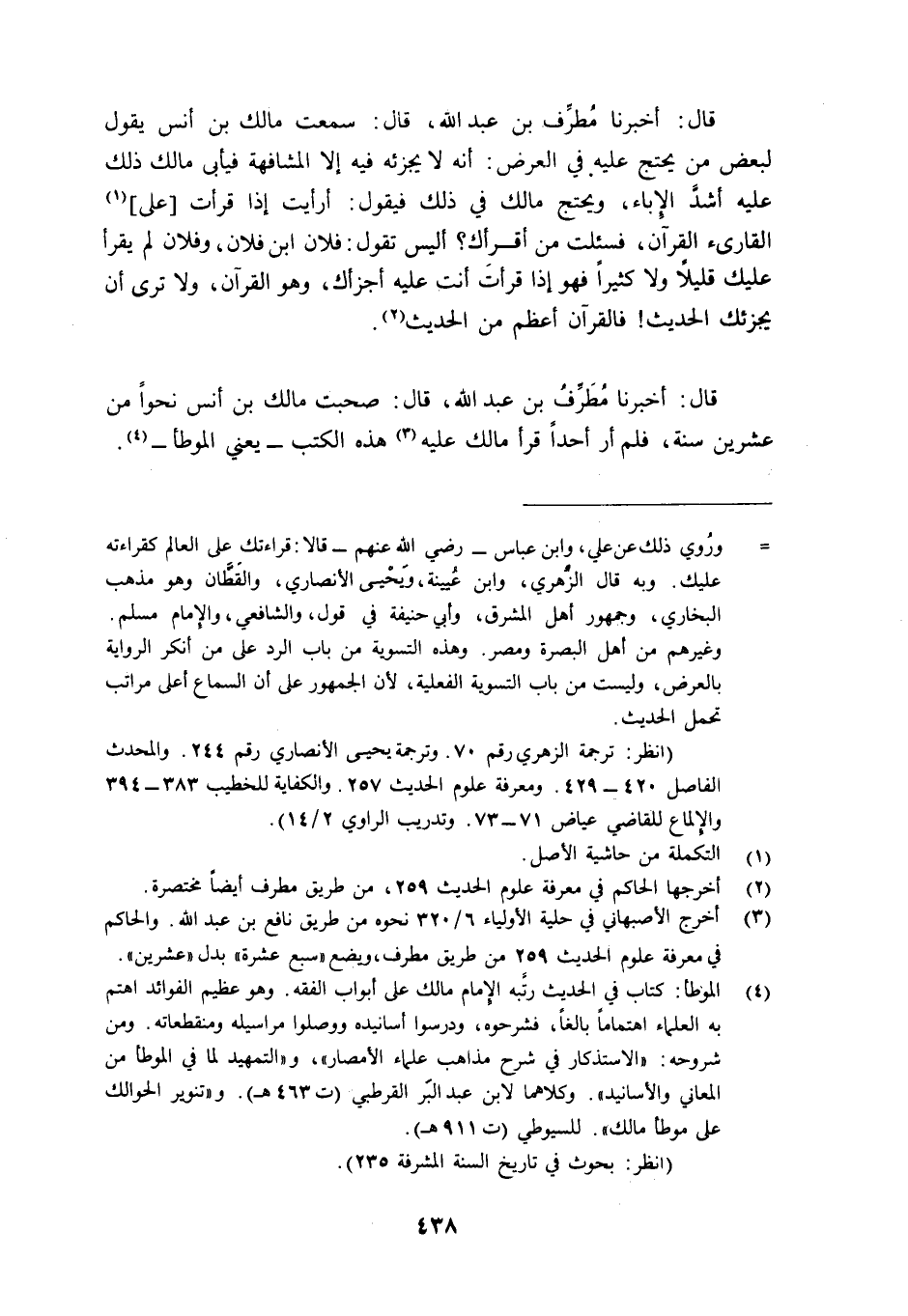 قَالَ: أَخْبَرَنَا مطرَّف بْنُ عَبْدِ اللَّهِ، قَالَ: "سَمِعْتُ مَالِكَ بْنَ أَنَسٍ يَقُولُ لِبَعْضِ مَنِ يحتج عَلَيْهِ فِي الْعَرْضِ: إِنَّهُ لَا يُجْزِئُهُ فِيهِ إِلَّا الْمُشَافَهَةُ فَيَأْبَى مَالِكٌ ذَلِكَ عَلَيْهِ أشدَّ الْإِبَاءِ، وَيَحْتَجُّ مَالِكٌ فِي ذَلِكَ فَيَقُولُ: أَرَأَيْتَ إِذَا قَرَأْتَ [عَلَى] 1 الْقَارِئِ الْقُرْآنَ، فَسُئِلْتَ مَنْ أقرأك؟ أليس تقول: فلان ابن فُلَانٍ، وَفُلَانٌ لَمْ يَقْرَأْ عَلَيْكَ قَلِيلًا وَلَا كَثِيرًا فَهُوَ إِذَا قَرَأْتَ أَنْتَ عَلَيْهِ أَجْزَأَكَ، وَهُوَ الْقُرْآنُ، وَلَا تَرَى أَنْ يُجْزِئَكَ الْحَدِيثُ! فَالْقُرْآنُ أَعْظَمُ مِنَ الْحَدِيثِ2.