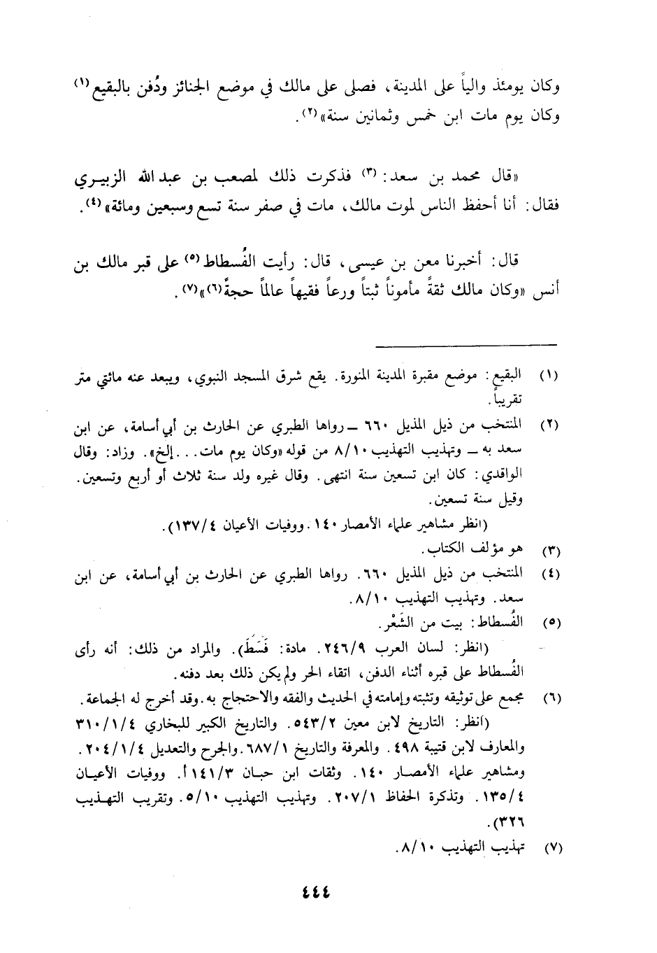 (قَالَ محمد بْنُ سَعْدٍ:3 "فَذَكَرْتُ ذَلِكَ لِمُصْعَبِ بْنِ عَبْدِ الله الزبيري" فقال: "أَنَا أَحْفَظُ النَّاسِ لِمَوْتِ مَالِكٍ، مَاتَ فِي صَفَرٍ سَنَةَ تِسْعٍ وَسَبْعِينَ وَمِائَةٍ) 4.
