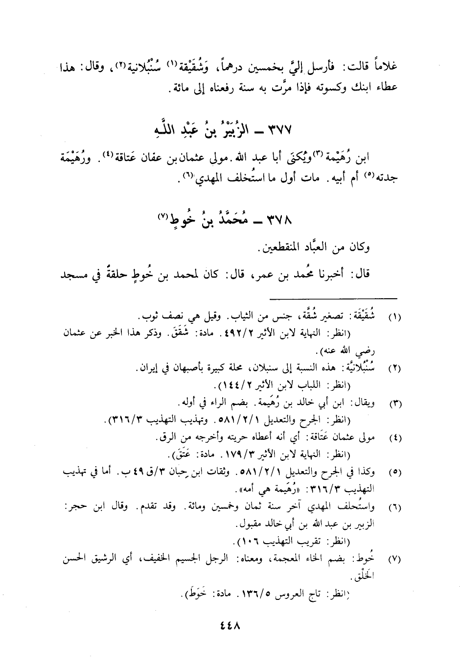 6 واستُخلف المهدي آخر سنة ثمان وخمسين ومائة. وقد تقدم. وقال ابن حجر: الزبير بن عبد الله بن أبي خالد مقبول. (انظر: تقريب التهذيب 106) .