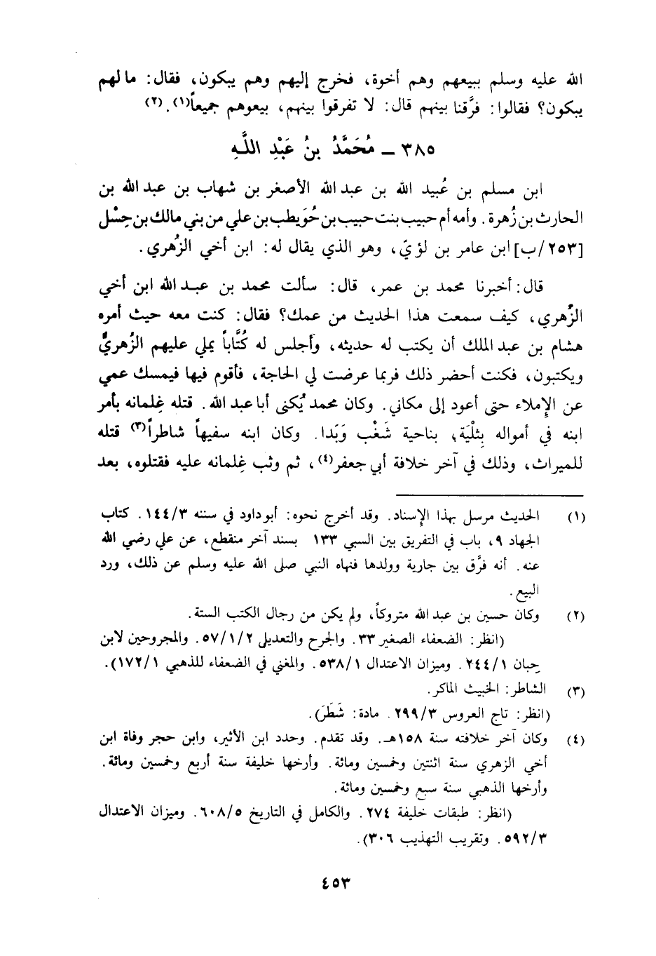 قَالَ: أَخْبَرَنَا مُحَمَّدُ بْنُ عُمَرَ، قَالَ: "سَأَلْتُ مُحَمَّدَ بْنَ عَبْدِ اللَّهِ ابْنَ أَخِي الزُّهْرِيِّ، كَيْفَ سَمِعْتَ هَذَا الْحَدِيثَ مِنْ عَمِّكِ؟ " فَقَالَ: "كُنْتُ مَعَهُ حَيْثُ أَمَرَهُ هِشَامُ بْنُ عَبْدِ الْمَلِكِ أَنْ يَكْتُبَ لَهُ حَدِيثَهُ، وَأَجْلَسَ لَهُ كُتَّاباً يُمْلِي عَلَيْهِمُ الزُهريٌّ وَيَكْتُبُونَ، فَكُنْتُ أَحْضُرُ ذَلِكَ فَرُبَّمَا عَرَضَتْ لِي الْحَاجَةُ، فَأَقُومُ فِيهَا فَيُمْسِكُ عَمِّي عَنِ الْإِمْلَاءِ حَتَّى أَعُودَ إِلَى مَكَانِي. وَكَانَ مُحَمَّدٌ يُكْنَى أَبَا عَبْدِ اللَّهِ. قَتَلَهُ غِلمانه بِأَمْرِ ابْنِهِ فِي أَمْوَالِهِ بِثلْيَة؛ بِنَاحِيَةِ شَغب وَبَدا. وَكَانَ ابْنُهُ سَفِيهًا شَاطِرًا3 قَتَلَهُ لِلْمِيرَاثِ، وَذَلِكَ فِي آخِرِ خِلَافَةِ أَبِي جَعْفَرٍ4، ثُمَّ وَثَبَ غِلمانه عليه فقتلوه، بعد