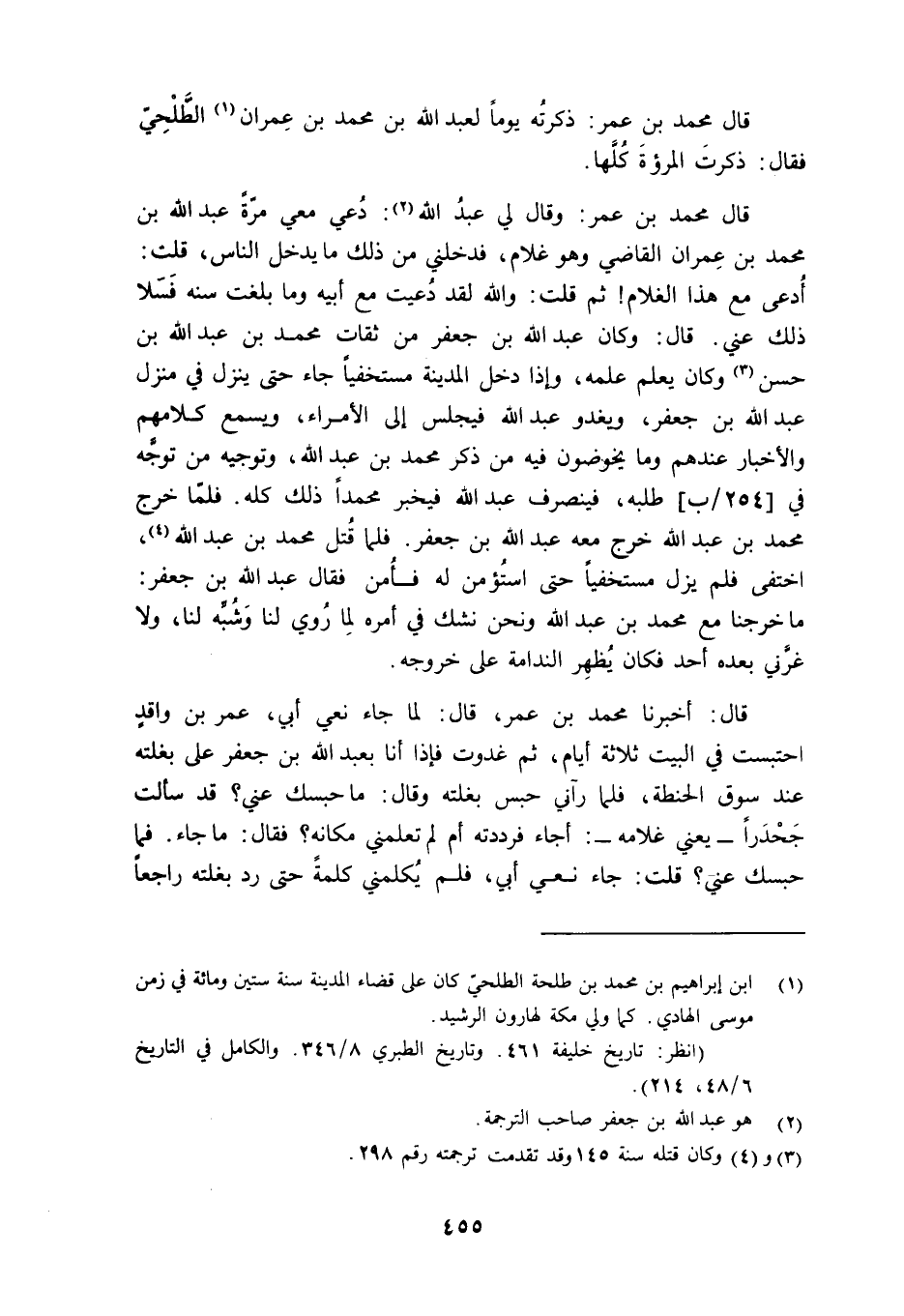قَالَ مُحَمَّدُ بْنُ عُمَرَ: وَقَالَ لِي عبدُ اللَّهِ2: "دُعي مَعِي مَرَّةً عَبْدُ اللَّهِ بن محمد ابن عِمران الْقَاضِي وَهُوَ غُلَامٌ، فَدَخَلَنِي مِنْ ذَلِكَ مَا يَدْخُلُ النَّاسَ، قُلْتُ: أُدعى مَعَ هَذَا الْغُلَامِ! ثُمَّ قُلْتُ: وَاللَّهِ لَقَدْ دُعيت مَعَ أَبِيهِ وَمَا بَلَغْتُ سِنَّهُ فَسَلَا ذَلِكَ عَنِّي. قَالَ: وَكَانَ عَبْدُ اللَّهِ بْنُ جَعْفَرٍ مِنْ ثِقَاتِ مُحَمَّدِ بْنِ عَبْدِ اللَّهِ بْنِ حَسَنٍ وَكَانَ يَعْلَمُ عِلْمَهُ، وَإِذَا دَخَلَ الْمَدِينَةَ مُسْتَخْفِيًا جَاءَ حَتَّى يَنْزِلَ فِي مَنْزِلِ عَبْدِ اللَّهِ بْنِ جَعْفَرٍ، وَيَغْدُو عَبْدُ اللَّهِ فَيَجْلِسُ إِلَى الْأُمَرَاءِ، وَيَسْمَعُ كَلَامَهُمْ وَالْأَخْبَارَ عِنْدَهُمْ وَمَا يَخُوضُونَ فِيهِ مِنْ ذِكْرِ مُحَمَّدِ بْنِ عَبْدِ اللَّهِ، وتوجيه من توجَّه في [254/ب] طَلَبِهِ، فَيَنْصَرِفُ عَبْدُ اللَّهِ فَيُخْبِرُ مُحَمَّدًا ذَلِكَ كُلَّهُ. فَلَمَّا خَرَجَ مُحَمَّدُ بْنُ عَبْدِ اللَّهِ خَرَجَ مَعَهُ عَبْدُ اللَّهِ بْنُ جَعْفَرٍ. فَلَمَّا قُتل مُحَمَّدُ بْنُ عَبْدِ اللَّهِ3، اخْتَفَى فَلَمْ يَزَلْ مُسْتَخْفِيًا حَتَّى استُؤمن لَهُ فَأَمِنَ فَقَالَ عَبْدُ اللَّهِ بْنُ جَعْفَرٍ: مَا خَرَجْنَا مَعَ مُحَمَّدِ بْنِ عَبْدِ اللَّهِ وَنَحْنُ نَشُكُّ فِي أَمْرِهِ لِما رُوي لَنَا وَشُبَّه لَنَا، وَلَا غرَّني بَعْدَهُ أَحَدٌ فَكَانَ يُظهر النَّدَامَةَ عَلَى خُرُوجِهِ".