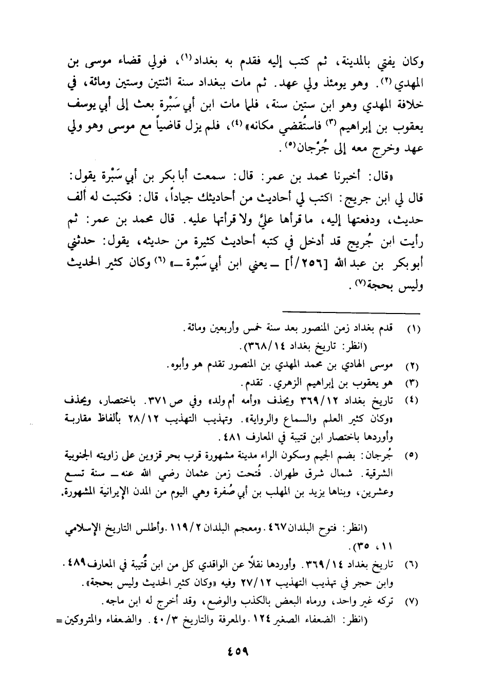6 تاريخ بغداد 14/369. وأوردها نقلاً عن الواقدي كل من ابن قتيبة في المعارف 489. وابن حجر في تهذيب التهذيب 12/27 وفيه (وكان كثير الحديث وليس بحجة) .