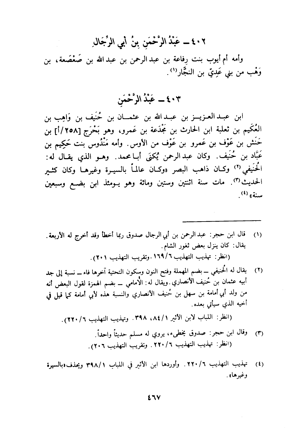 ابن عَبْدِ الْعَزِيزِ بْنِ عَبْدِ اللَّهِ بْنِ عُثْمَانَ بْنِ حُنيف بْنِ وَاهِب بْنِ العُكَيم بْنِ ثعلبة بن الحارث بن مَجْدَعة بن عَمرو، وهو بَحْرَج [258/أ] بن حَنَش بن عوف بن عَمرو بن عَوْفٍ مِنَ الْأَوْسِ. وَأُمُّهُ مَنْدُوس بِنْتُ حَكِيمِ بْنِ عَبَّادِ بْنِ حُنيف. وَكَانَ عَبْدُ الرَّحْمَنِ يُكْنَى أَبَا مُحَمَّدٍ. وَهُوَ الَّذِي يُقَالُ لَهُ: الحُنَيْفي2 وَكَانَ ذَاهِبَ الْبَصَرِ (وَكَانَ عَالِمًا بِالسِّيرَةِ وَغَيْرَهَا وَكَانَ كَثِيرَ الْحَدِيثِ3. مَاتَ سَنَةَ اثْنَتَيْنِ وَسِتِّينَ وَمِائَةٍ وَهُوَ يَوْمَئِذٍ ابْنُ بِضْعٍ وَسَبْعِينَ سنة4.
